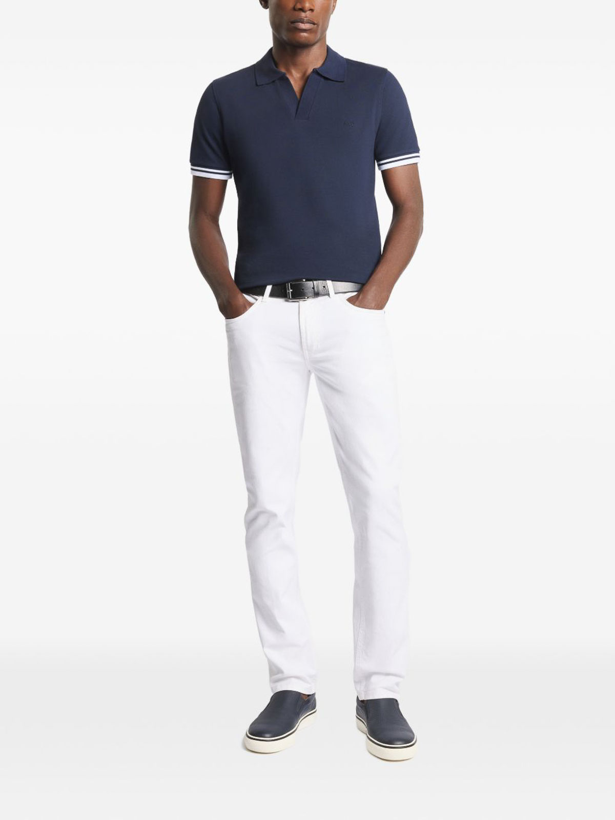 Polo en coton piqué bleu foncé avec col en V, manches courtes et poignets rayés de la marque Fay, doté d'une texture piquée structurée et de détails de poignets raffinés. Parfait pour les tenues décontractées chics ou les looks raffinés de tous les jours, ce polo allie style contemporain, confort et artisanat haut de gamme