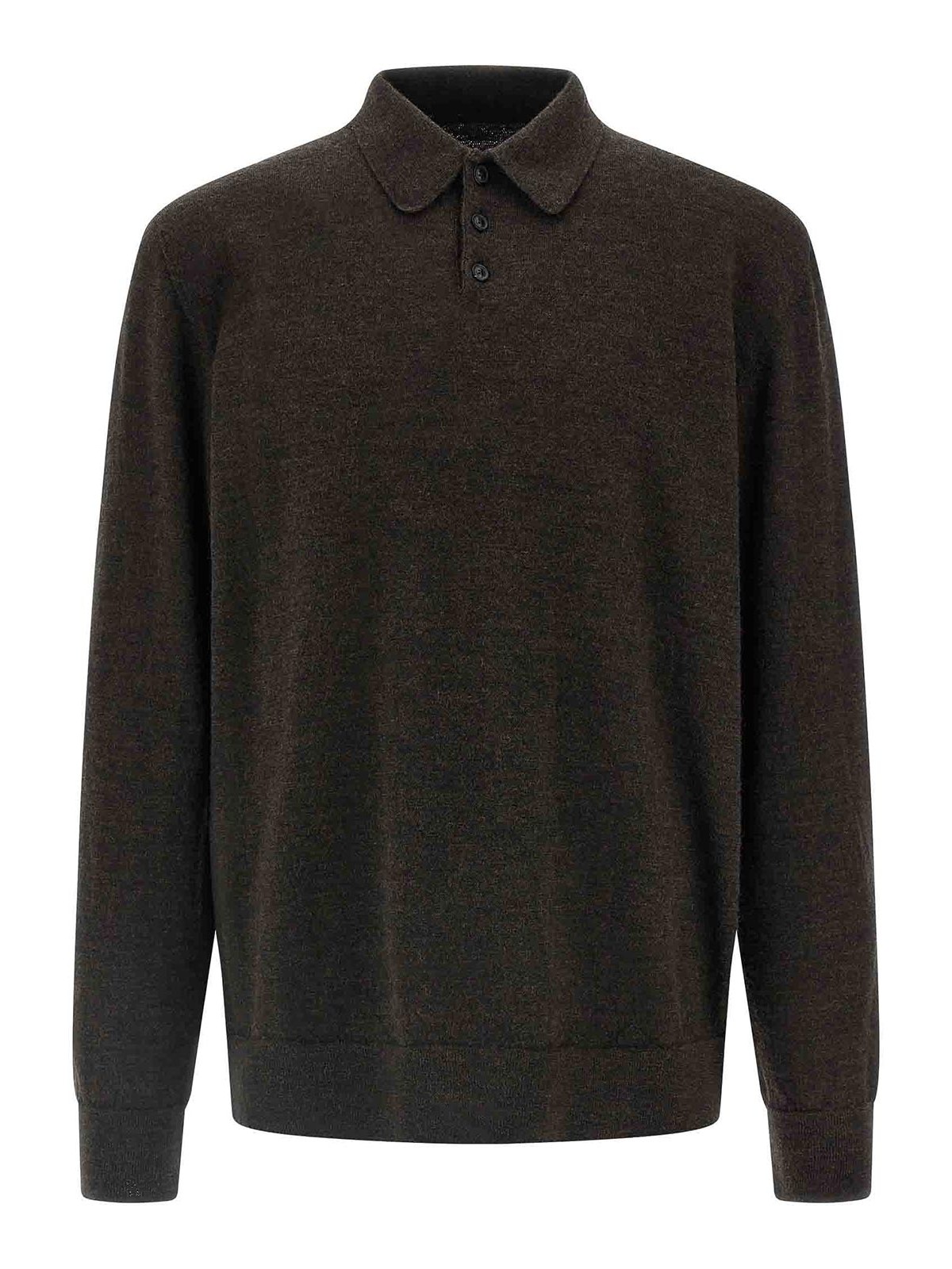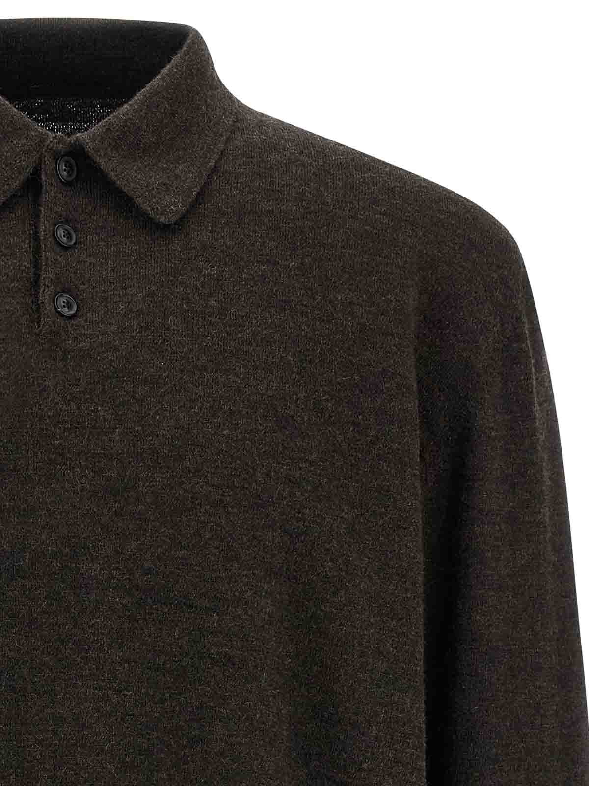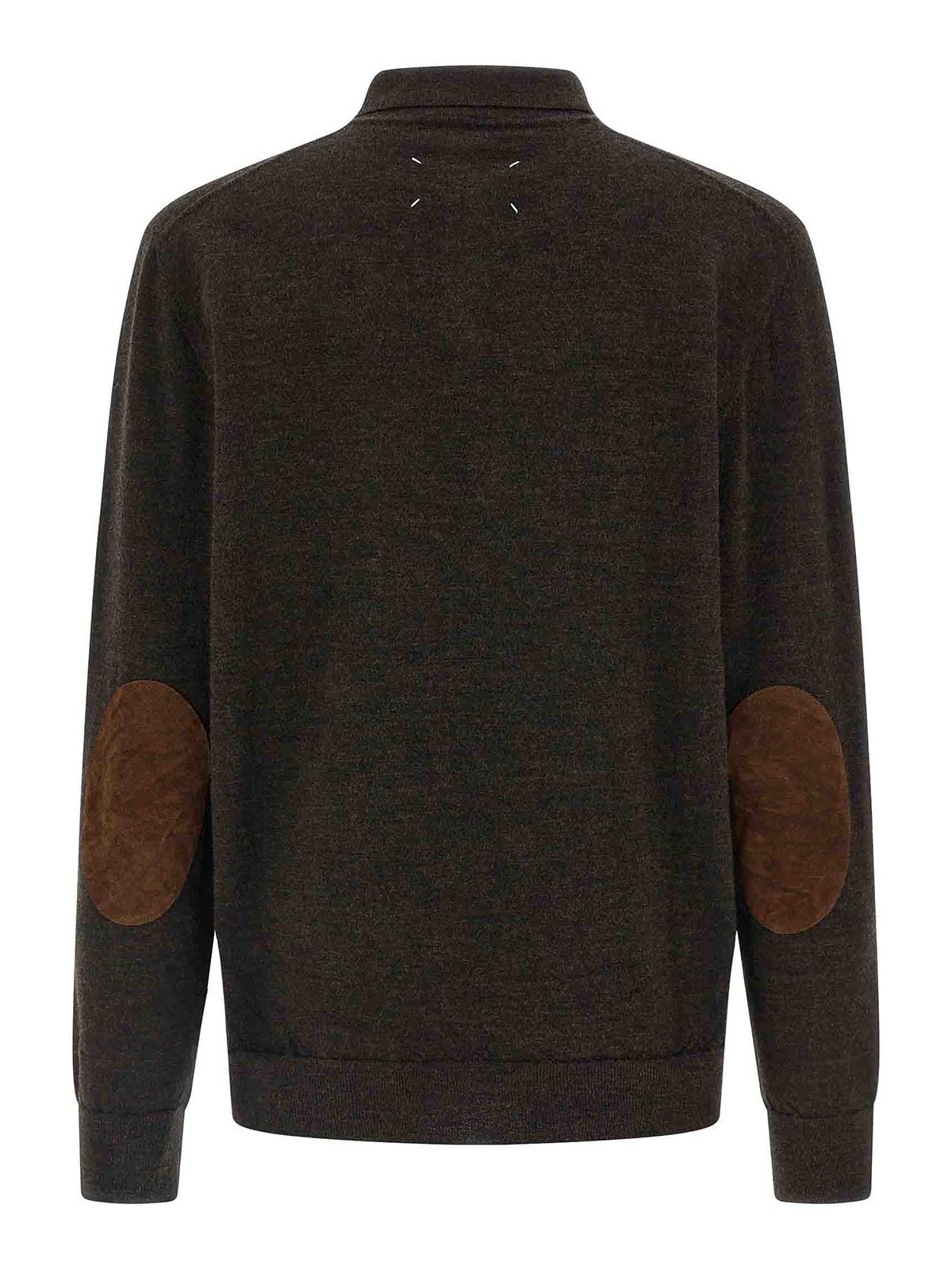 Polo en laine, col et boutons, manches longues à revers, coudière en daim, « quatre points » dans le dos.