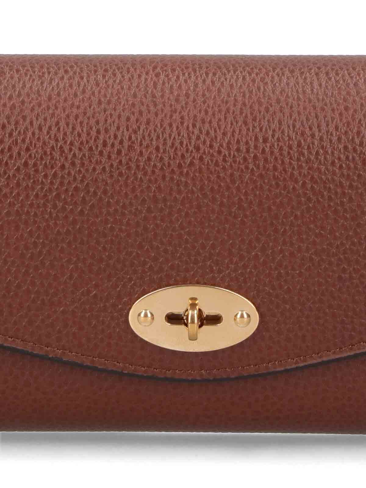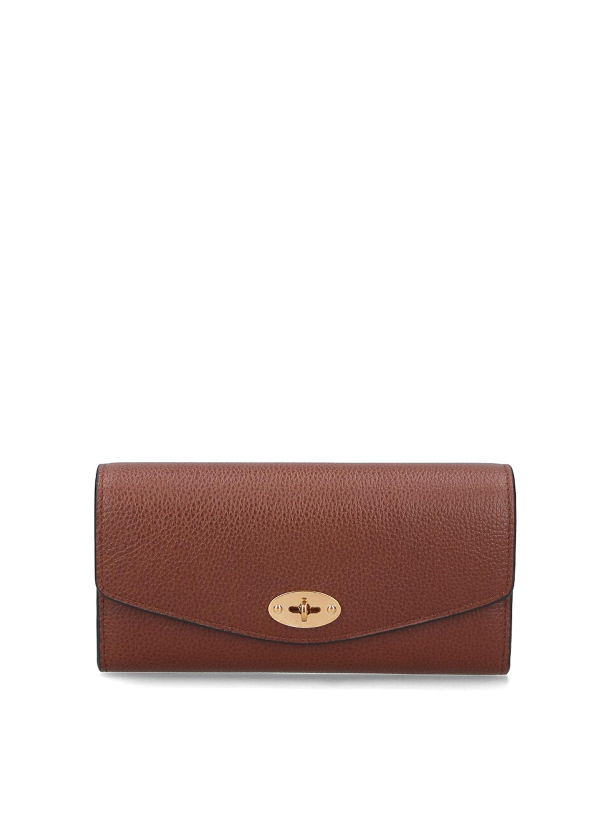Portefeuille Mulberry Darley, en cuir de veau marron, rabat, fermeture à torsion sur le devant en métal doré, une poche intérieure zippée, une poche plate, trois compartiments intérieurs principaux, une poche arrière plate, logo intérieur embossé.