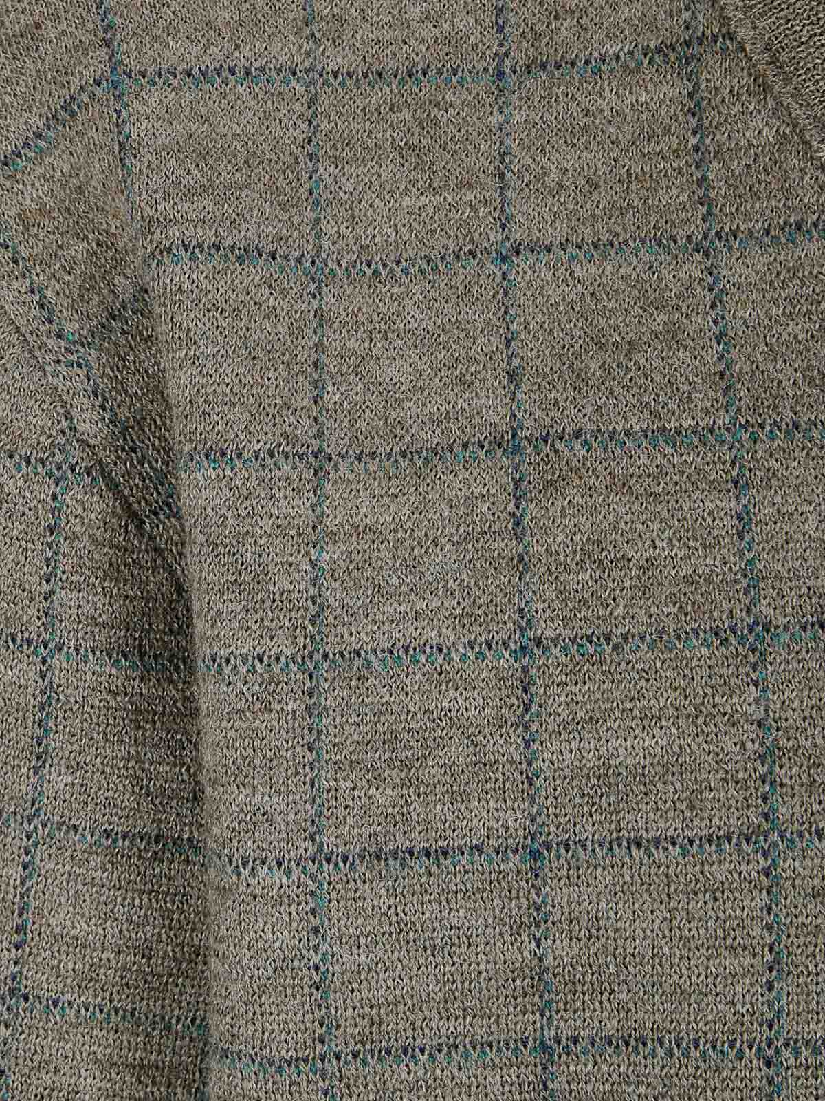 Pull à col en V, texture à carreaux, manches basses, détails effet vieilli.