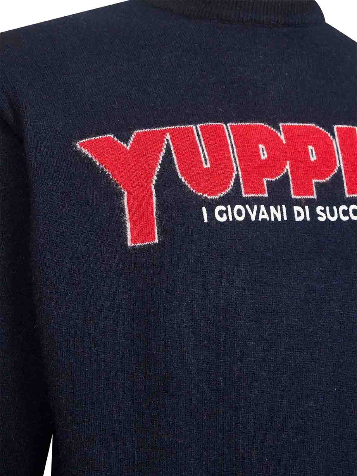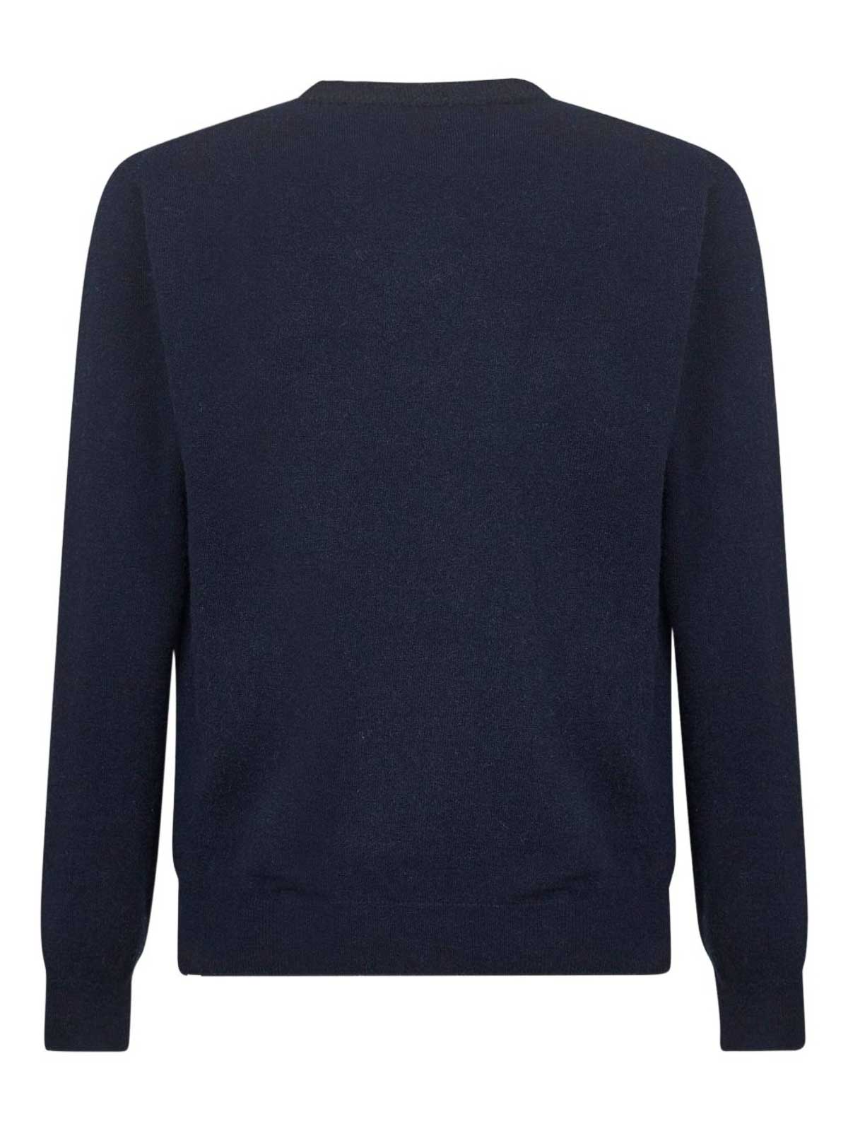 Origin Italy présente un col rond côtelé bleu marine, des manches longues, une écriture jacquard et des ourlets côtelés