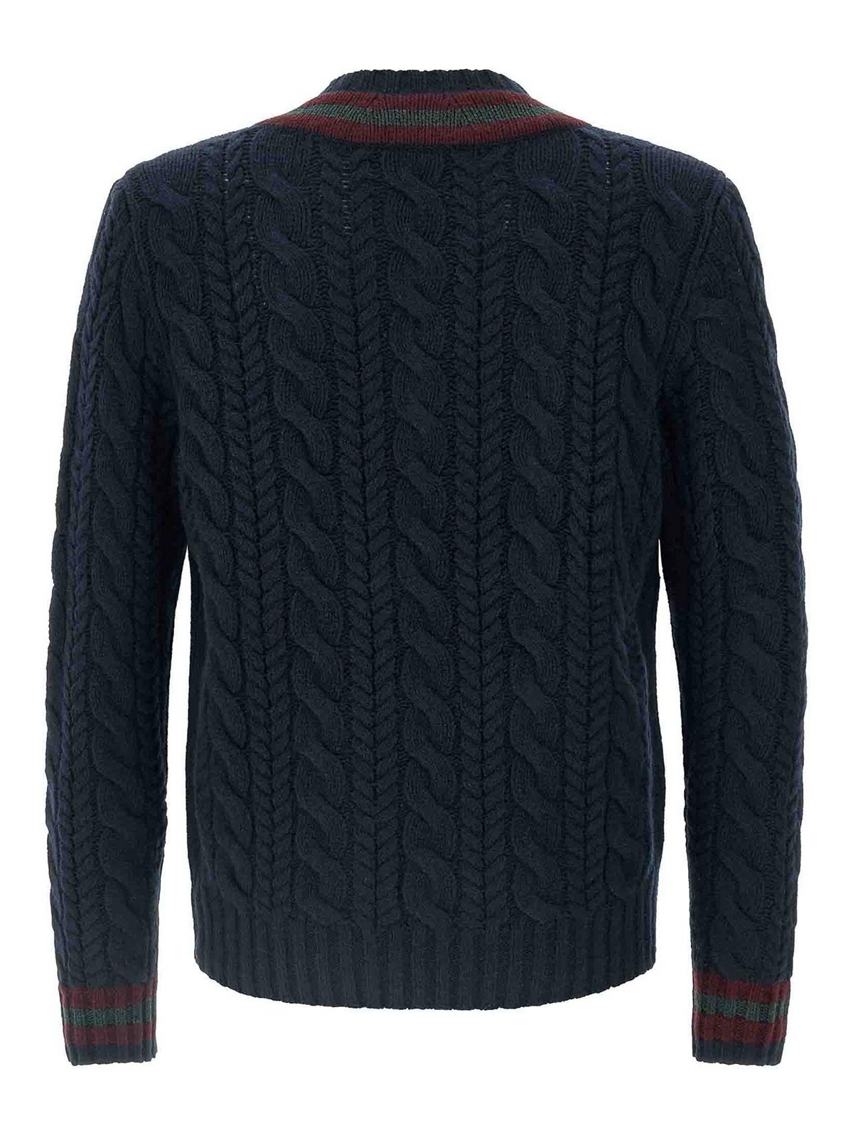 Pull en laine mélangée en cachemire avec maille torsadée, col en V, logo intarsia, manches longues à revers.