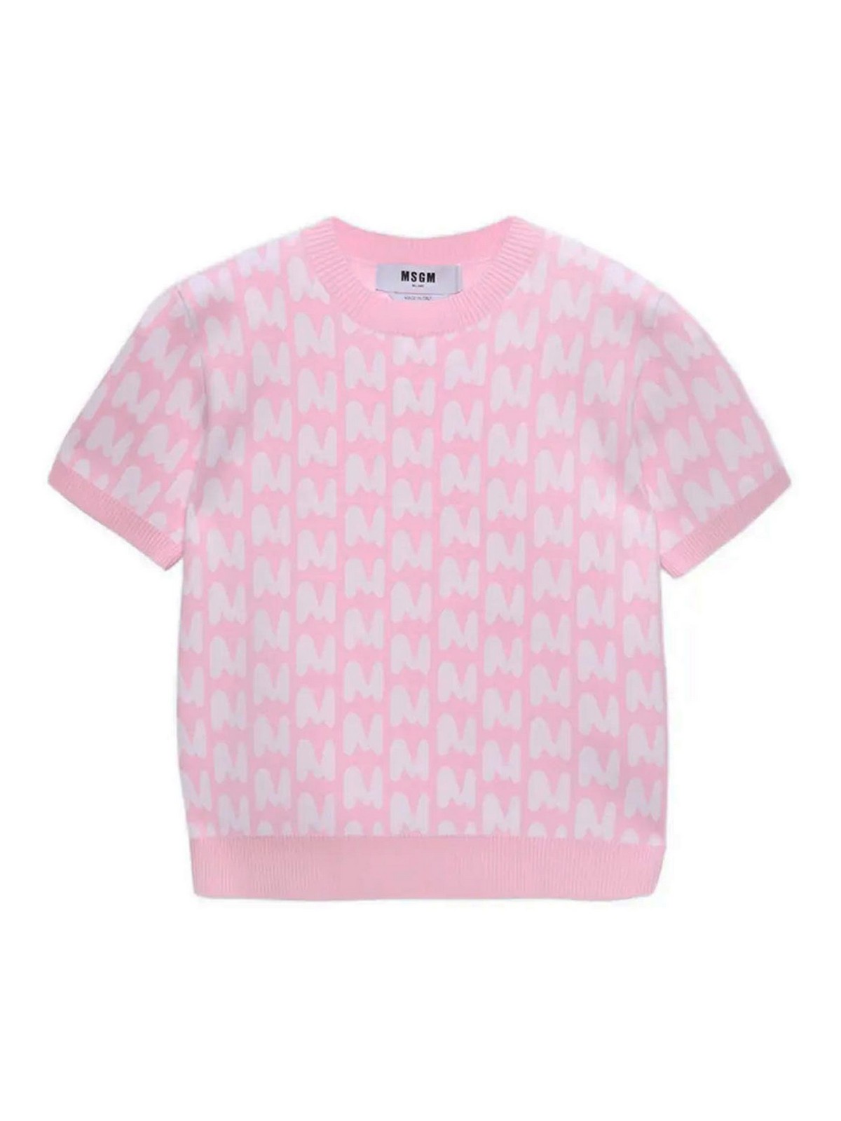 Col rond, manches courtes, jacquard mwave, rose/blanc.