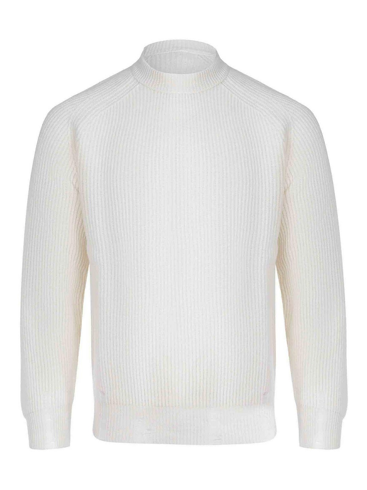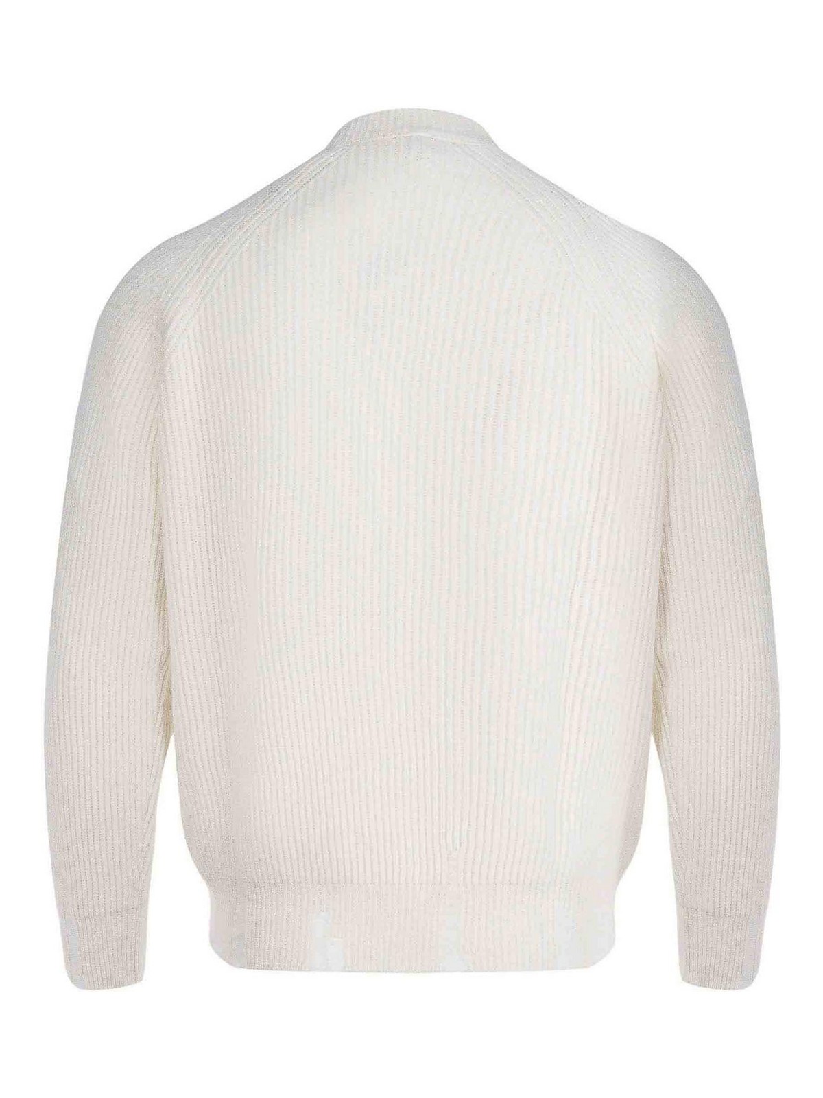 Pull Atomo Factory en mélange de laine et de cachemire de couleur crème, côtelé, col, manches longues, légères déchirures à l'ourlet et aux poignets, 90 % laine, 10 % cachemire fabriqué en Italie