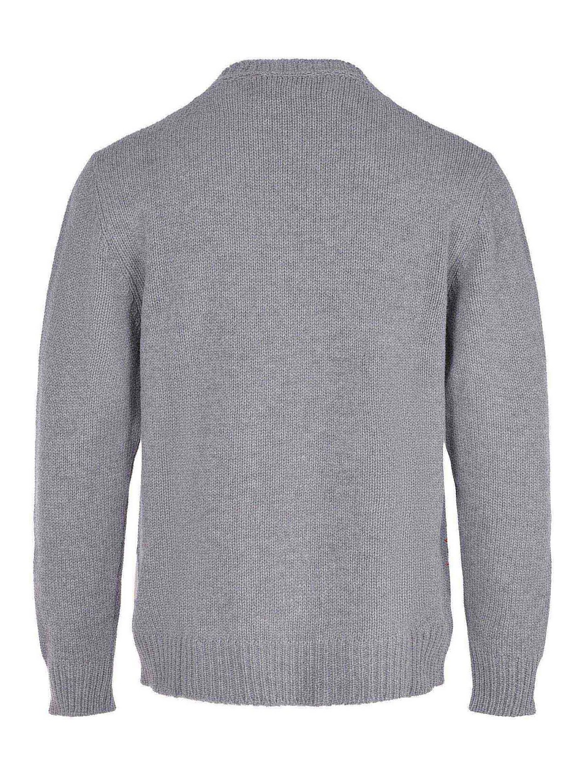 Pull bordeaux en laine grise, col rond côtelé, manches longues, poignets et ourlet côtelés, logo monogramme imprimé sur le devant en contraste, 100% laine fabriquée en Italie