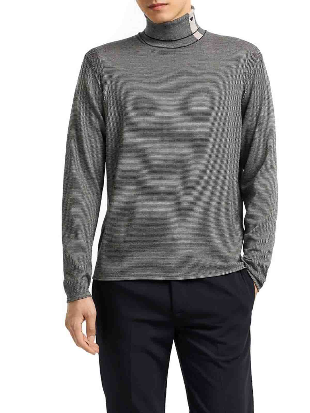 Pull à col roulé en jacquard en laine vierge avec surpiqûres en éponge rayées, détail du col et broderies en micro-aigles. Les coutures en jacquard éponge créent un motif dense de micro-rayures horizontales bicolores.