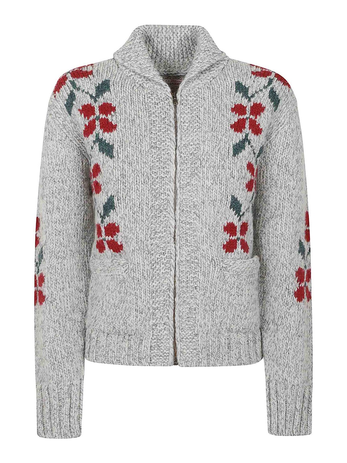 Cardigan en laine grise, empiècements floraux en jacquard, fermeture zippée, poches plaquées, ourlet et poignets côtelés.