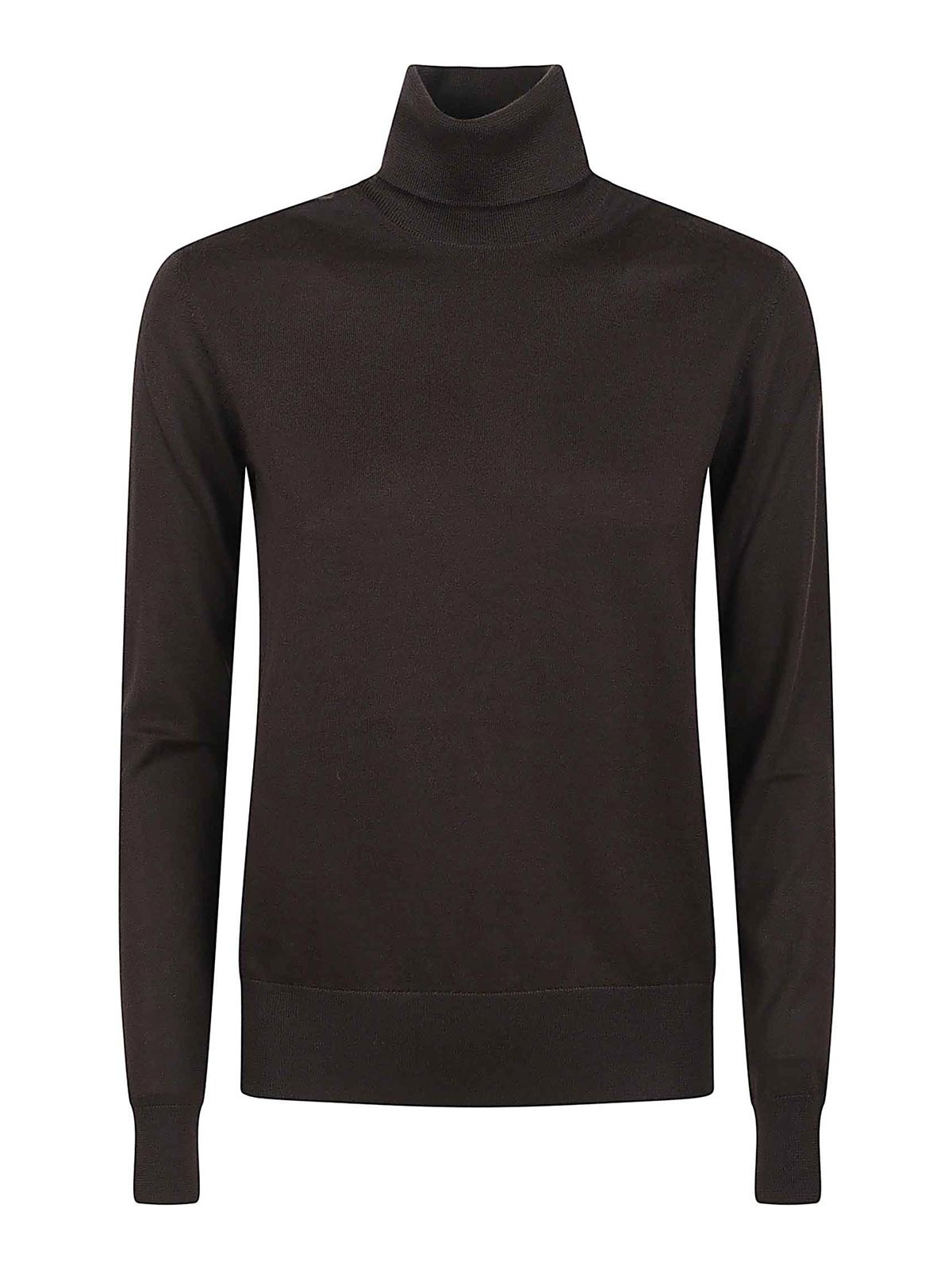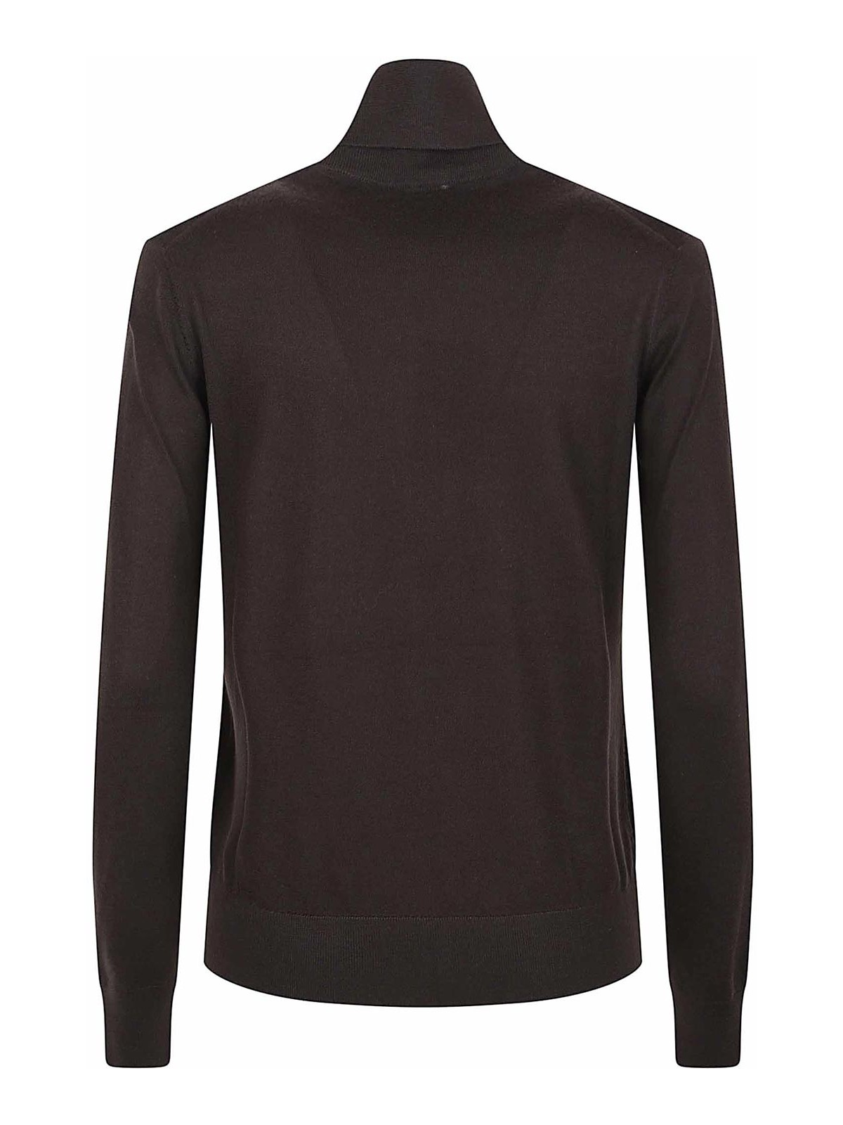 « col roulé marron foncé, manches longues, ourlet replié, poignets repliés »