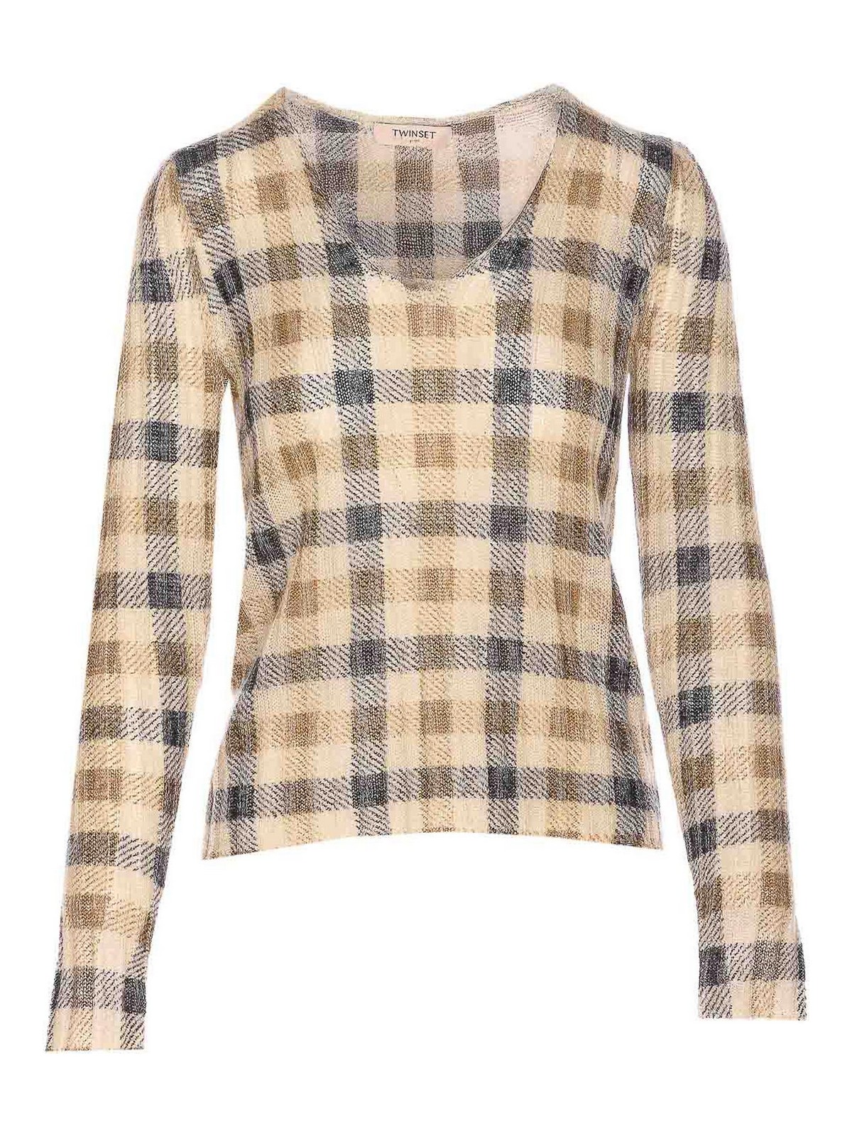 Pull beige Twinset, encolure large, manches longues, motif à carreaux