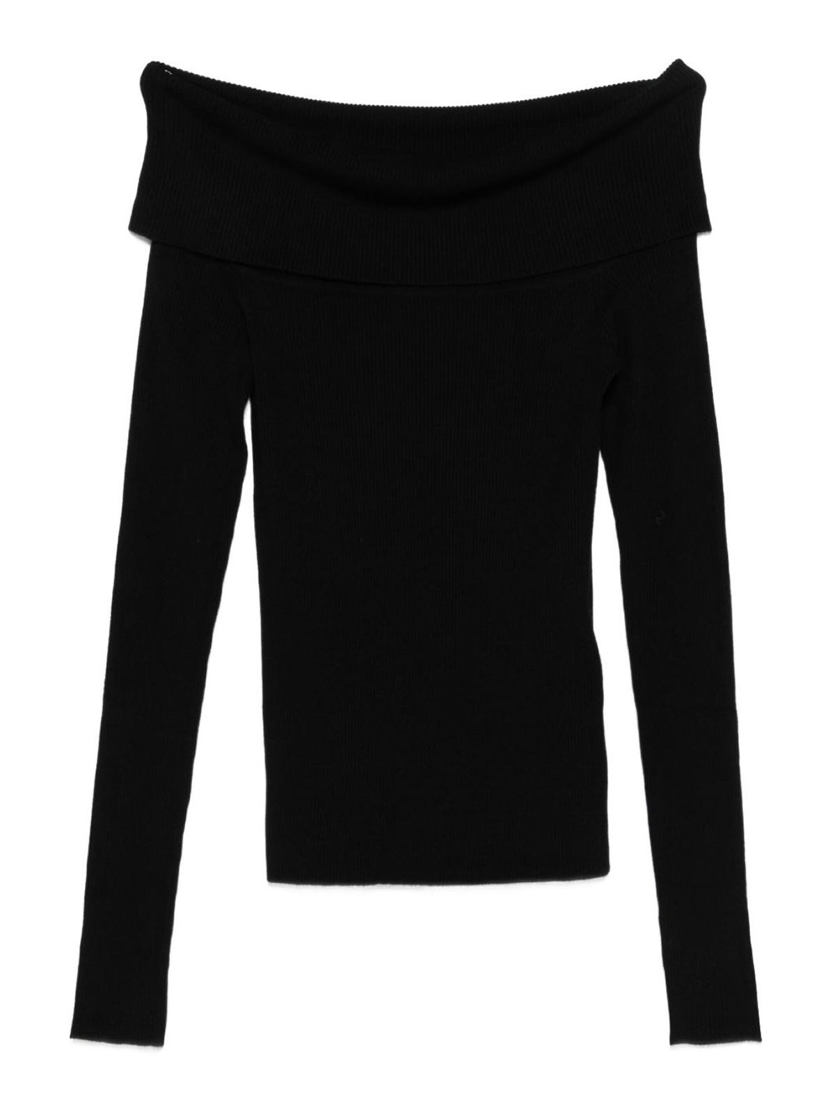 Encolure noire à épaules dénudées, texture côtelée, manches longues, ourlet droit