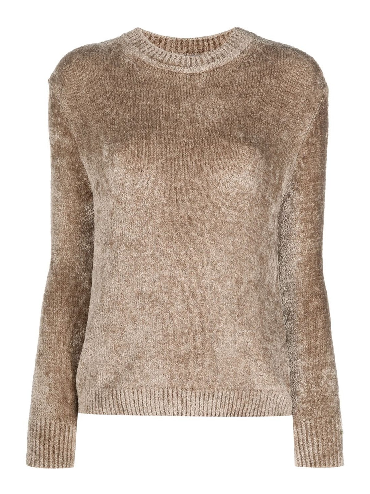 Pull en chenille Herno en tricot beige, col rond, épaules baissées, manches longues, poignets et ourlet côtelés