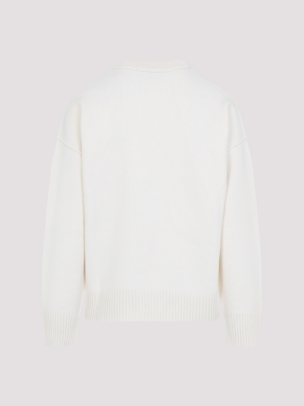 Pull à col rond blanc cassé et rouge Ami ADC confectionné en blanc cassé, coutures intérieures et extérieures, col rond, logo rouge contrasté, incrustation de logo contrastant sur la poitrine, épaules tombantes, manches longues, bords côtelés