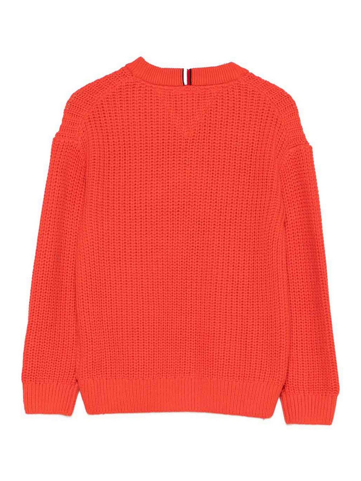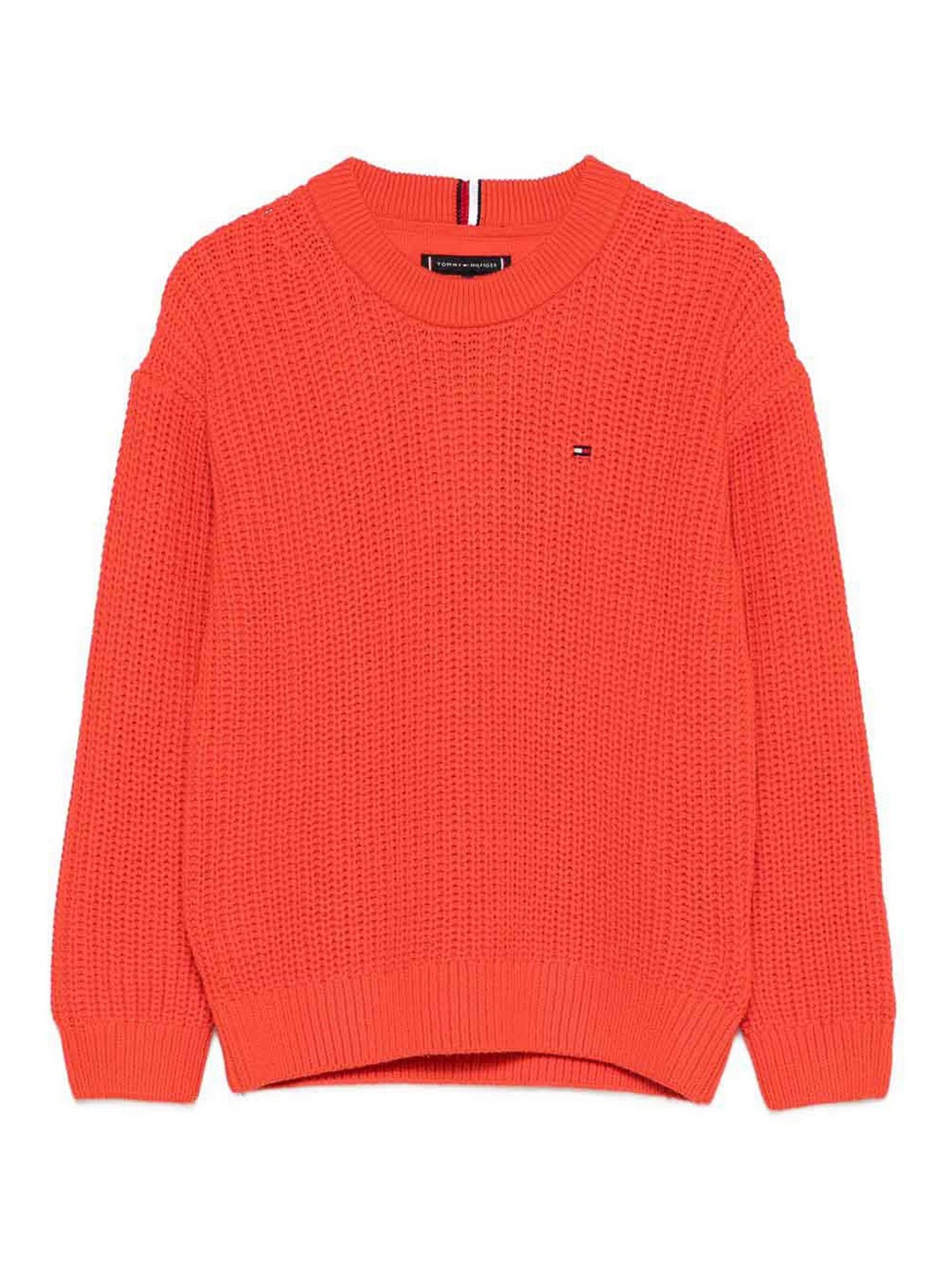 Pull en maille orange corail de Tommy Hilfiger pour enfants, doté d'un col rond, de manches longues, d'un ourlet côtelé et d'un logo sur la poitrine, une pièce confortable et élégante idéale