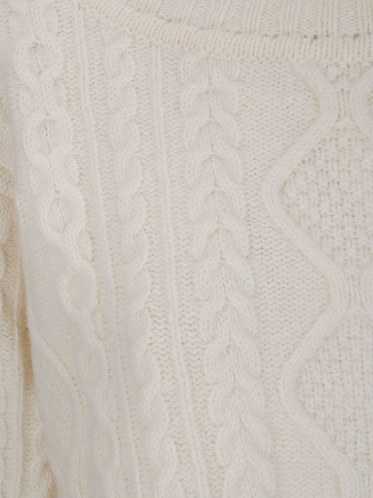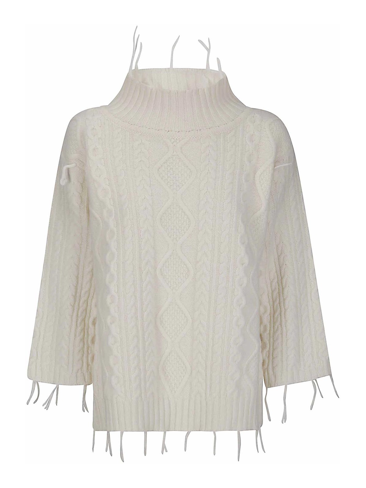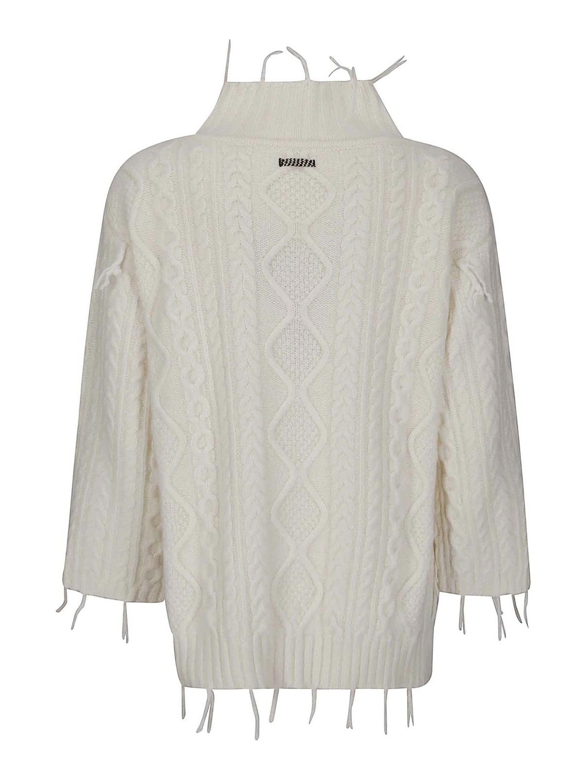 Pull à col montant, maille torsadée épaisse, bords à effet détruit.