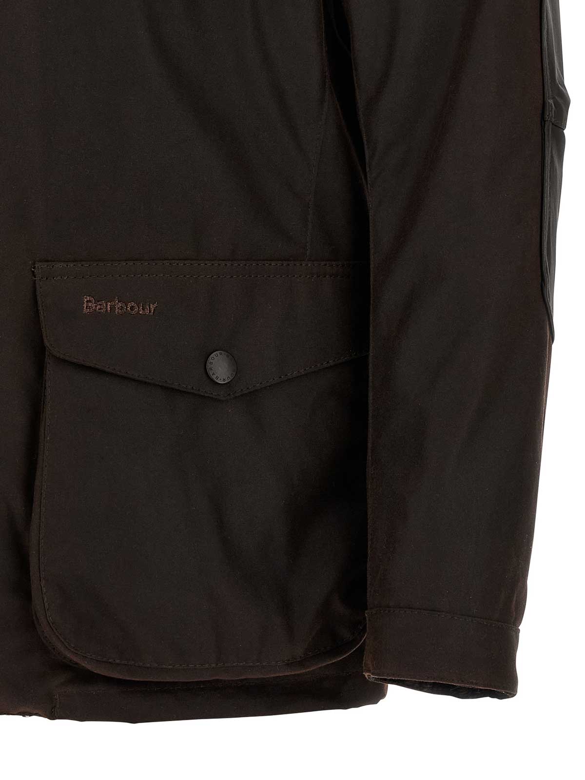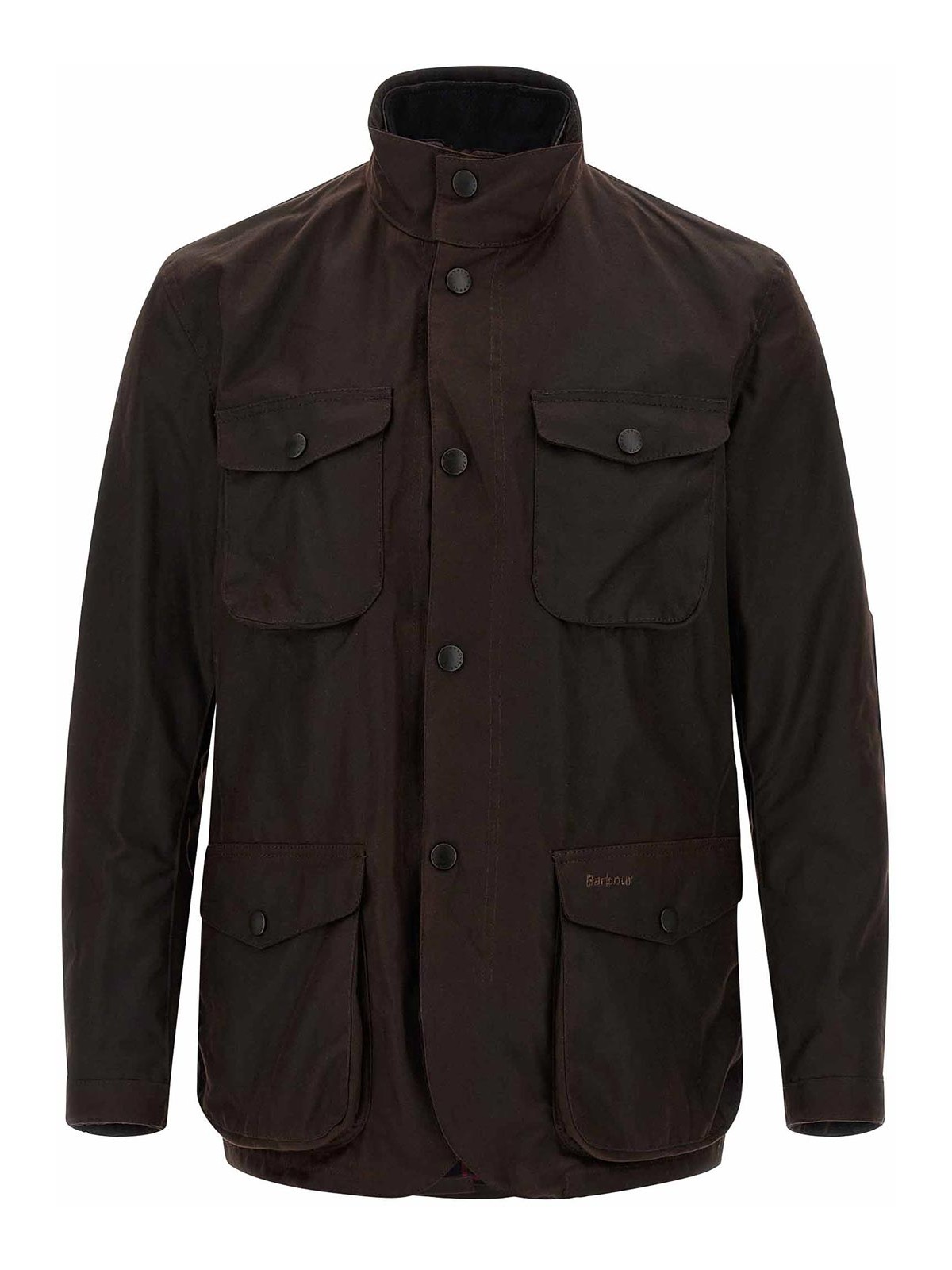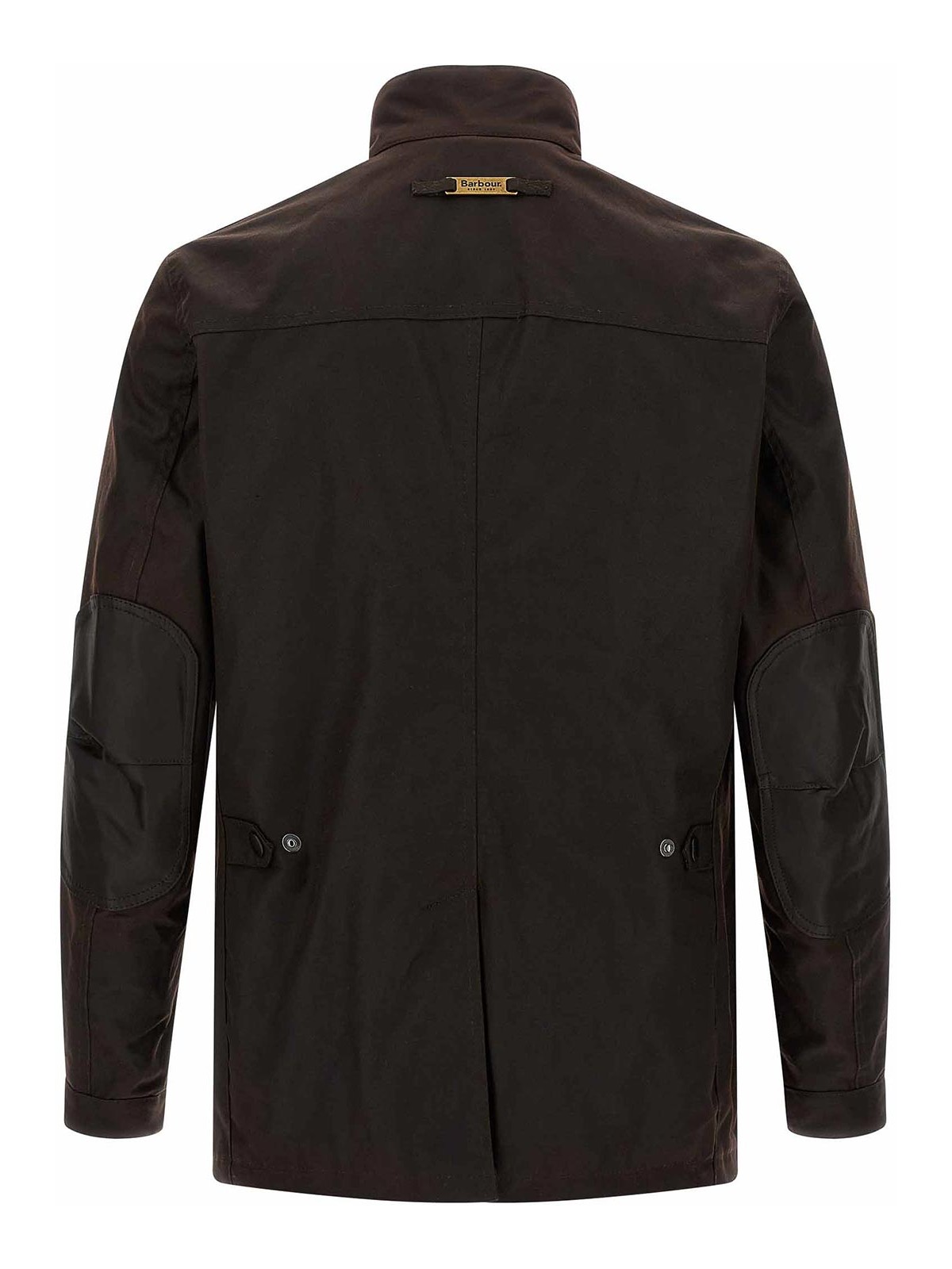 Veste en coton ciré Ogston avec doublure en tissu à carreaux, fermeture à bouton-pression sur le devant avec insert en tissu matelassé, col haut et fermeture zippée, poches, manches longues avec coudière en cuir, fente arrière.