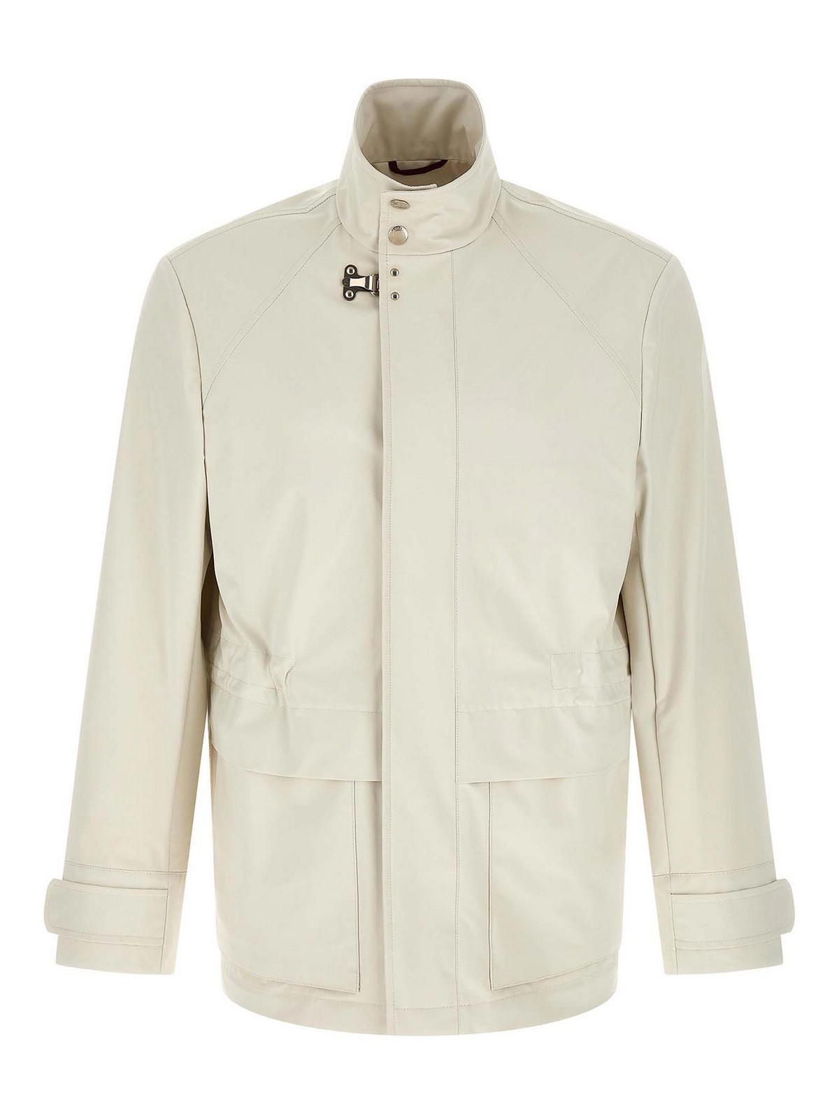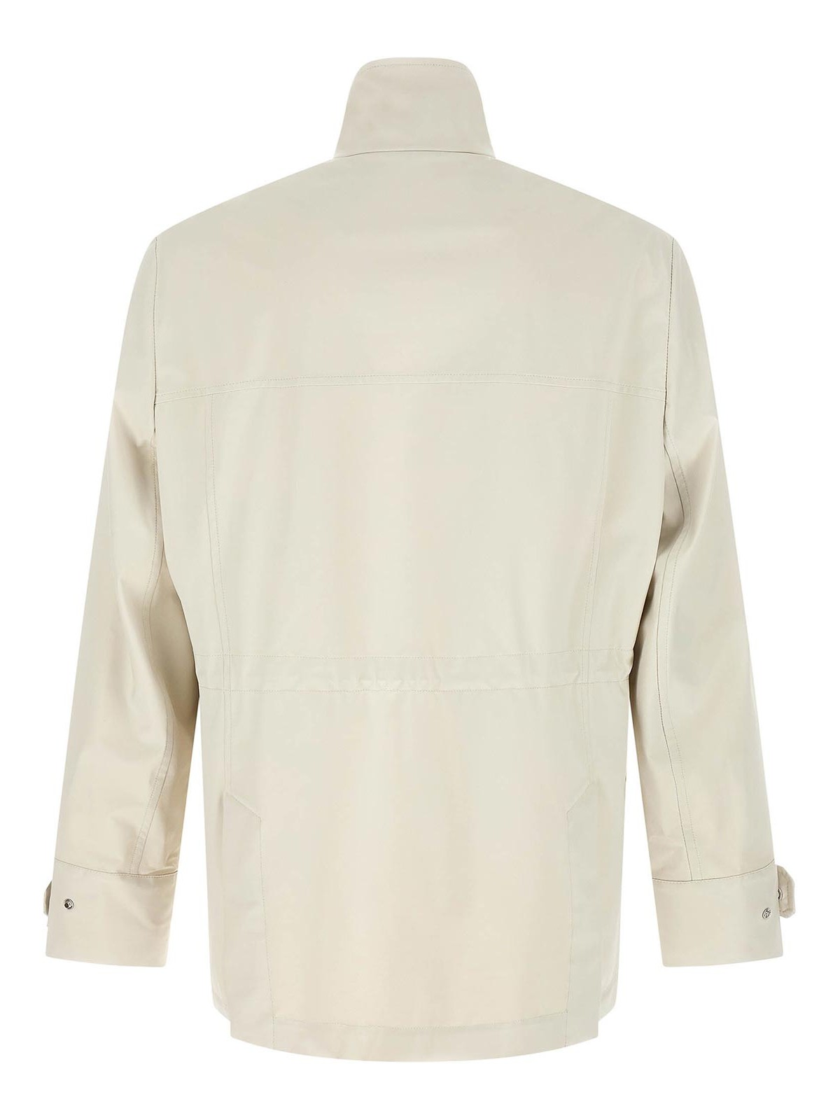 Coupe-vent en tissu technique imperméable, non doublé, col haut avec boutons-pression, fermeture zippée, housse à rabat avec fermeture à crochet en métal et boutons-pression, poches avant plaquées, cordon de serrage intérieur à la taille, manches longues avec sangle réglable avec boutons-pression, double fente latérale dans le dos.