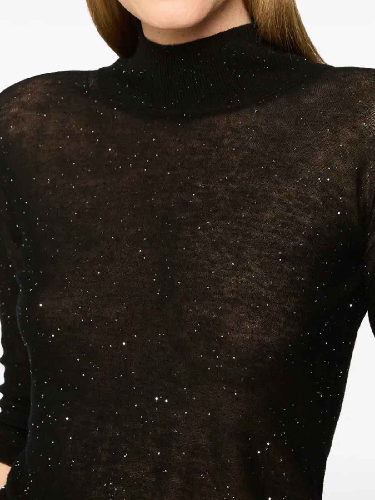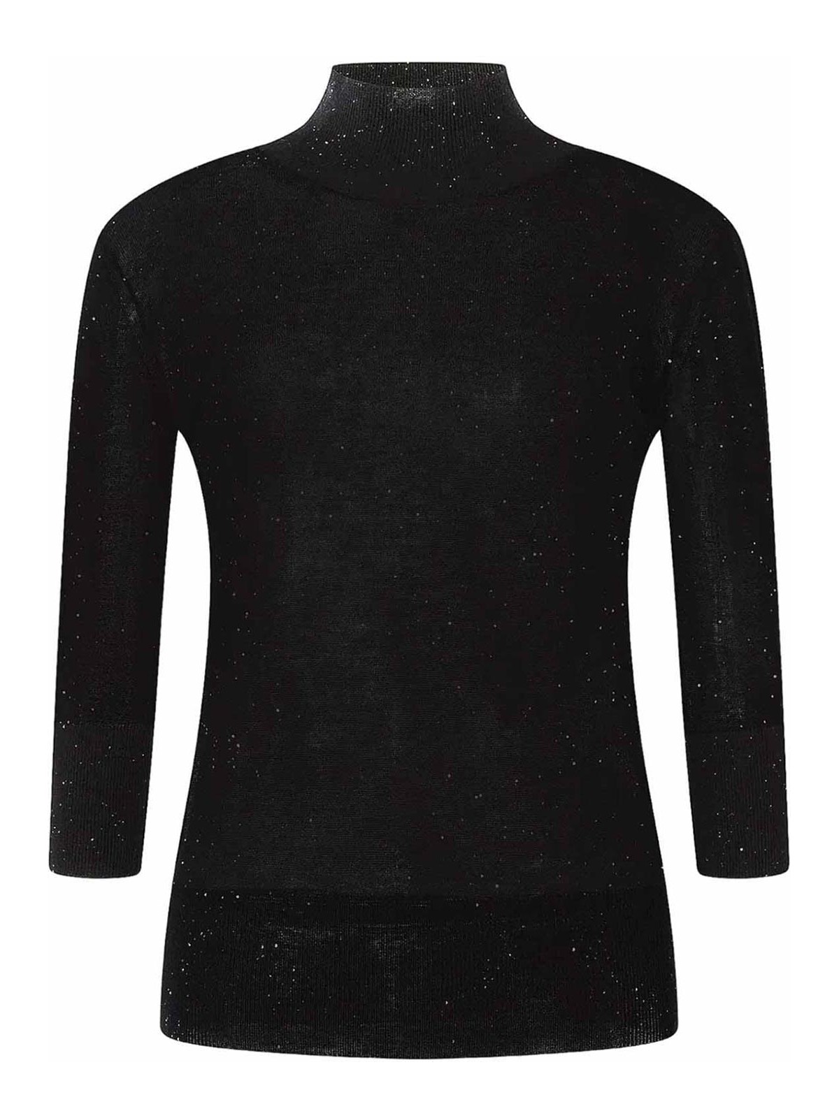 Pull à col montant à manches 3/4, confectionné en laine fine ultralégère. les micro-paillettes le long du fil créent un effet scintillant et sophistiqué. ourlet et poignets côtelés. design ajusté. composition : 98 % laine, 2 % polyester fabriqué en Italie