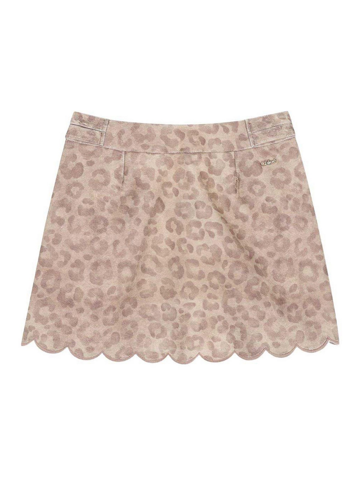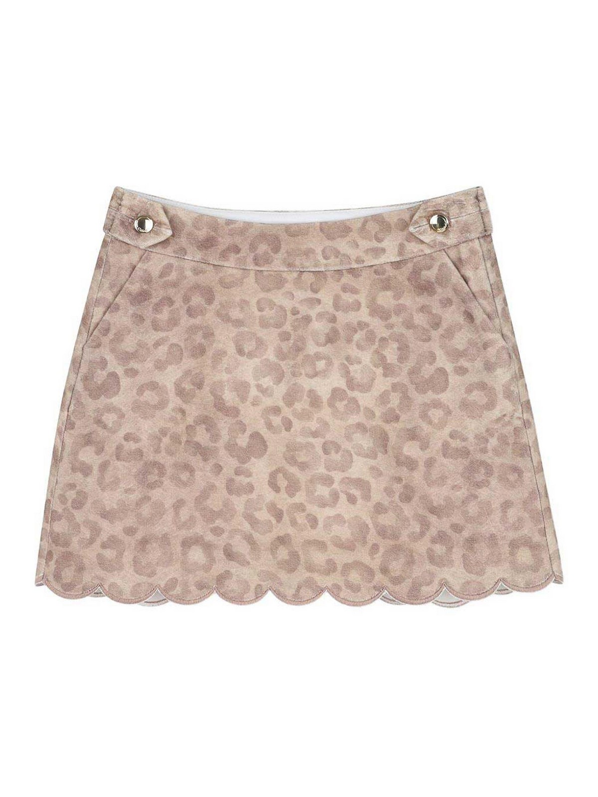 Ourlet festonné beige à imprimé léopard sur toute la surface, boutons décoratifs contrastants, poches fendues latérales