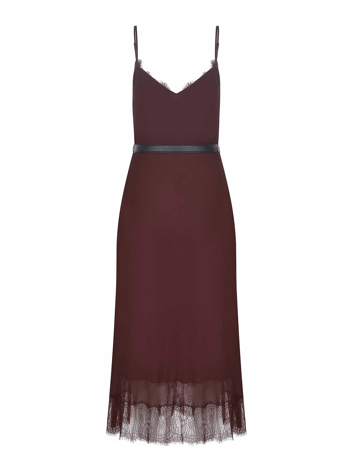 Robe d'autoportrait en viscose brune.Col en V. fines bretelles ajustables.Détails en dentelle sur la poitrine.Fermeture boutonnée sur la poitrine.Ceinture en cuir amovible. Ourlet en dentelle.Doublure .100% viscose.