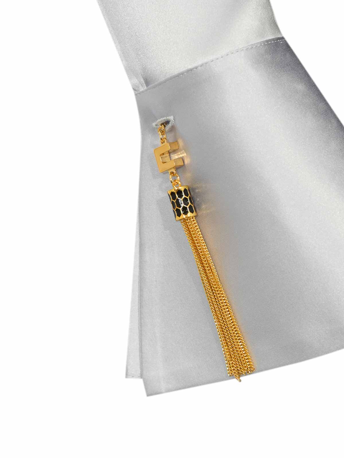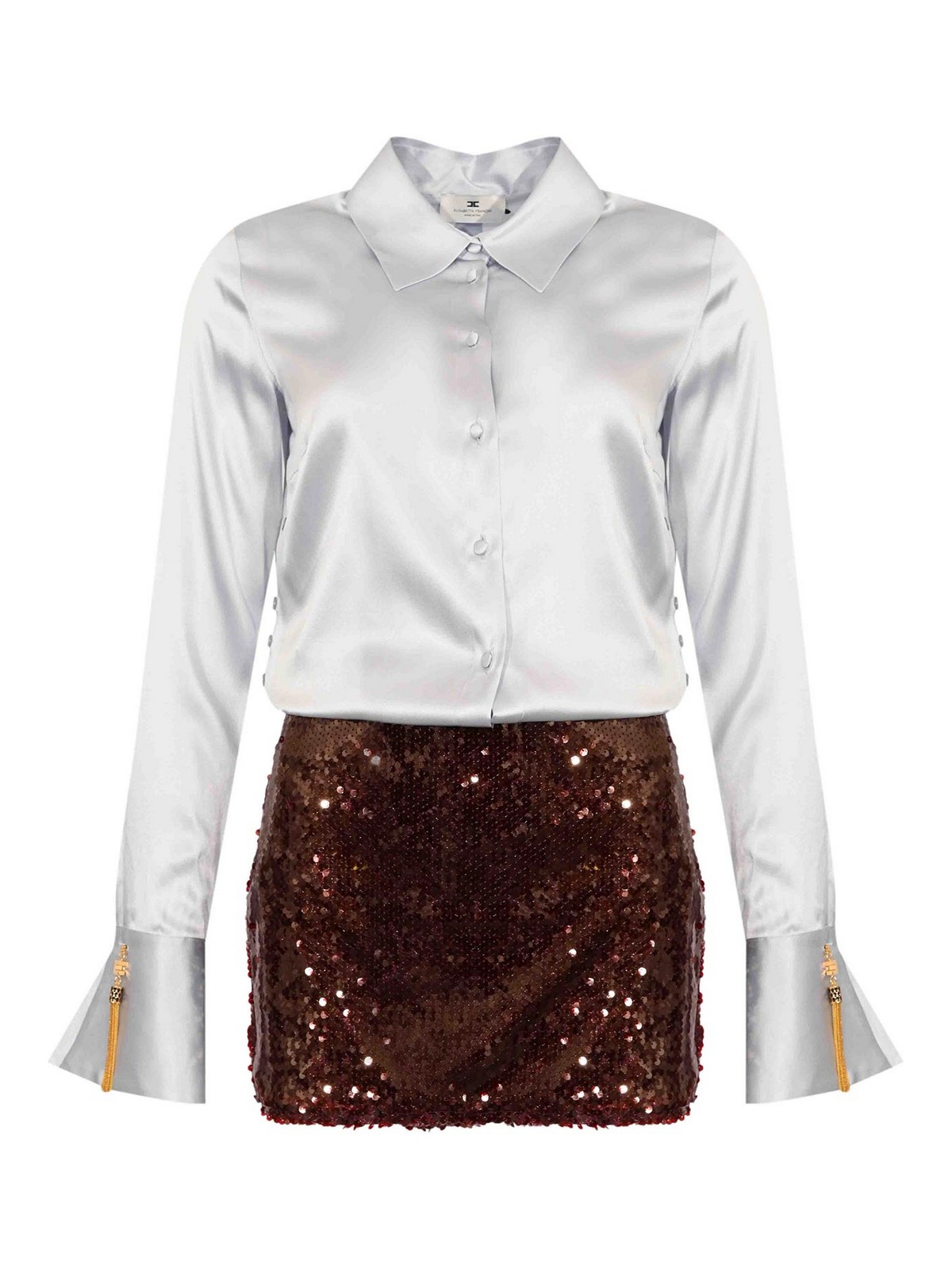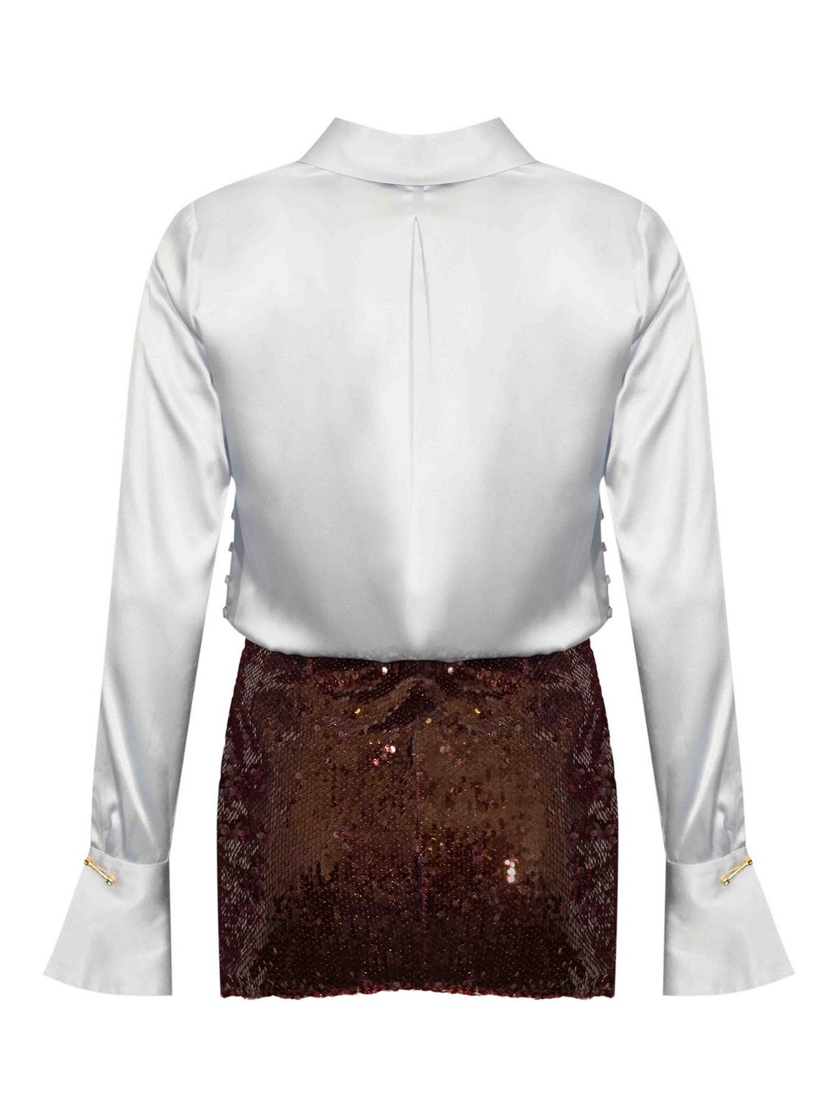 Col chemisier en satin, manches longues, boutons de manchette ornés de bijoux avec logo et pompons en peau de serpent, jupe amovible à texture de paillettes, jupe en tricot zippée latérale, coupe ajustée