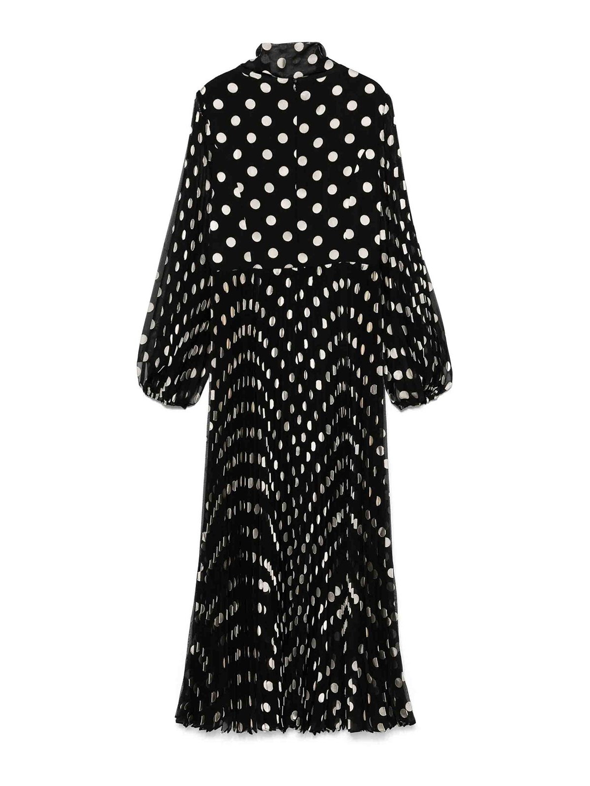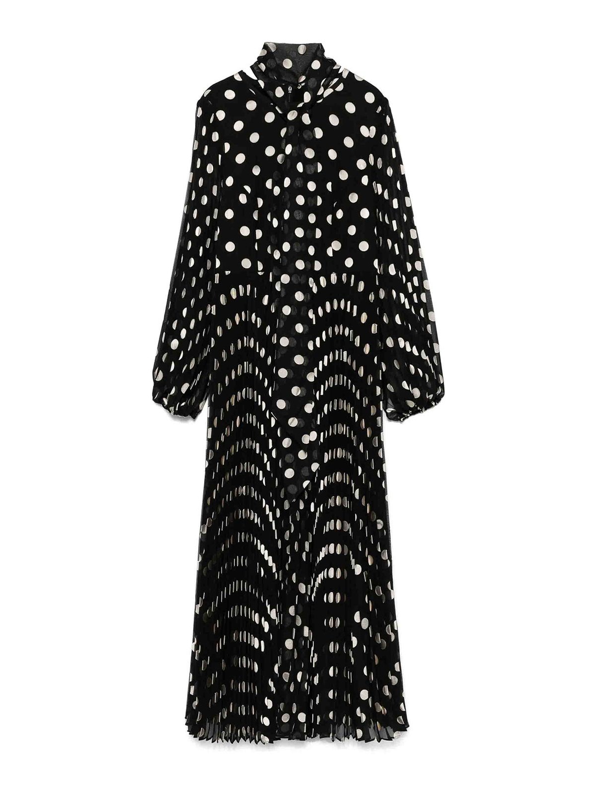 couleur design : noir crème, mélange de polyester et de viscose, fermeture zippée arrière dissimulée, cravate à nouer, col haut, manches ballon, poignets élastiqués, jupe plissée, entièrement doublée.