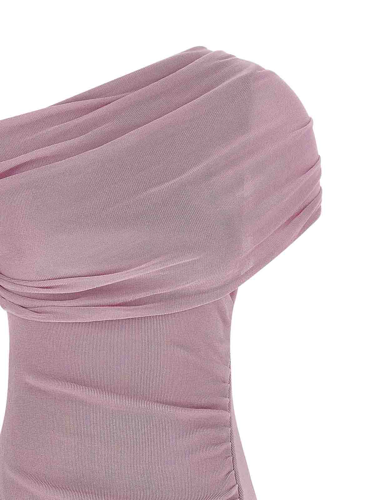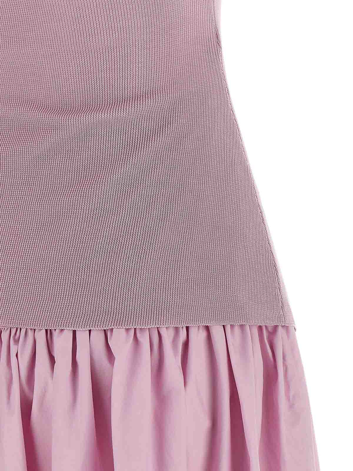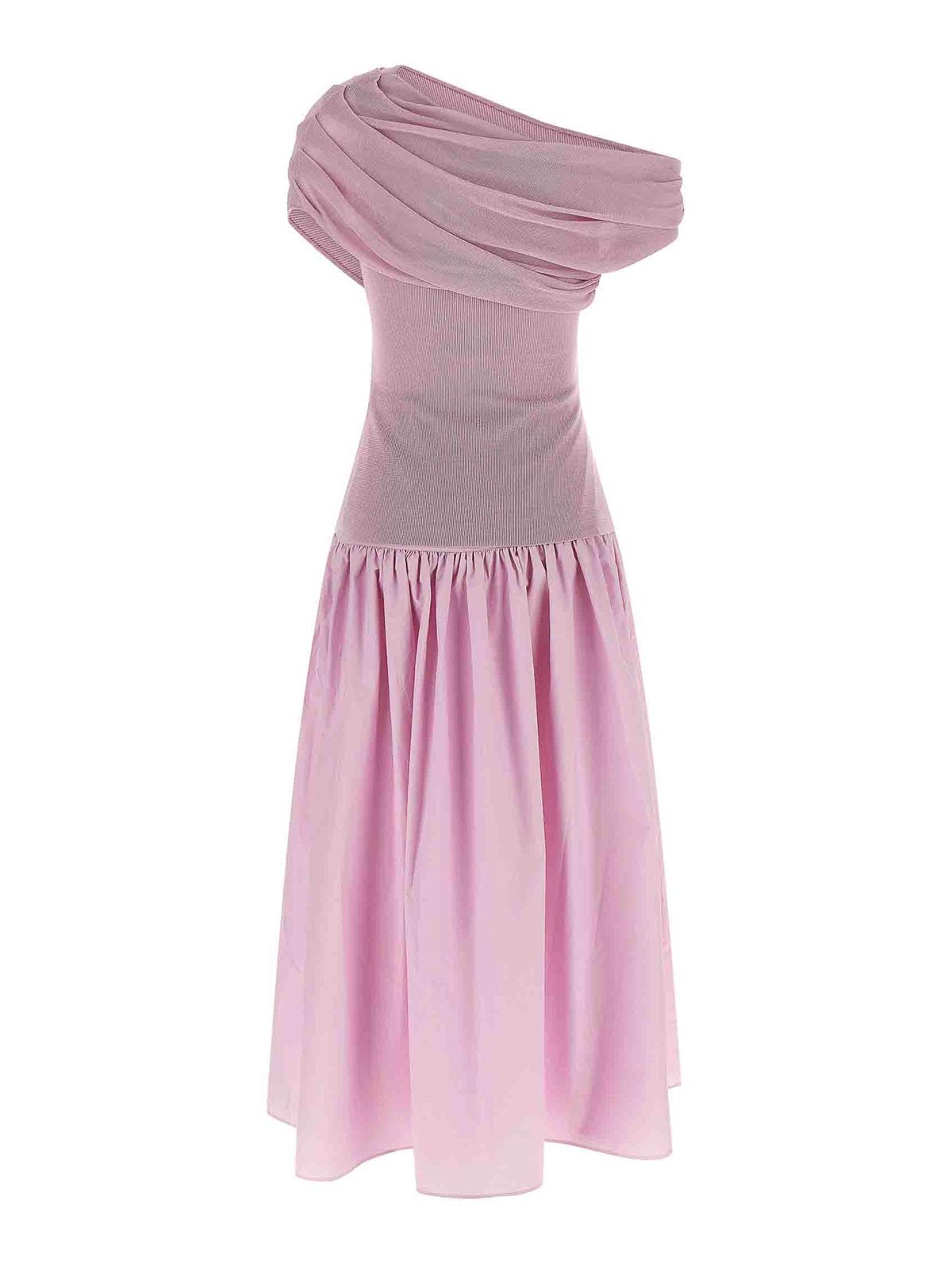 robe midi à épaules dénudées en tricot drapé de coton rose avec haut en tricot drapé à encolure asymétrique, buste frisé sur le devant, manches courtes et bas amovible en popeline de coton, silhouette évasée bouclée sur roulettes, taille haute, fermeture zippée latérale.