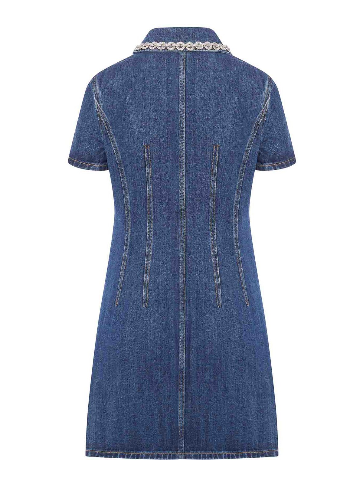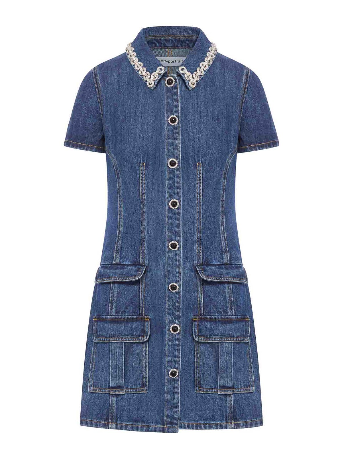Mini-robe en jean avec applications de bijoux, col classique avec strass, manches courtes, quatre poches à rabat sur le devant, fermeture à pression sur le devant, coutures contrastantes, 100 % coton, couleur : bleu