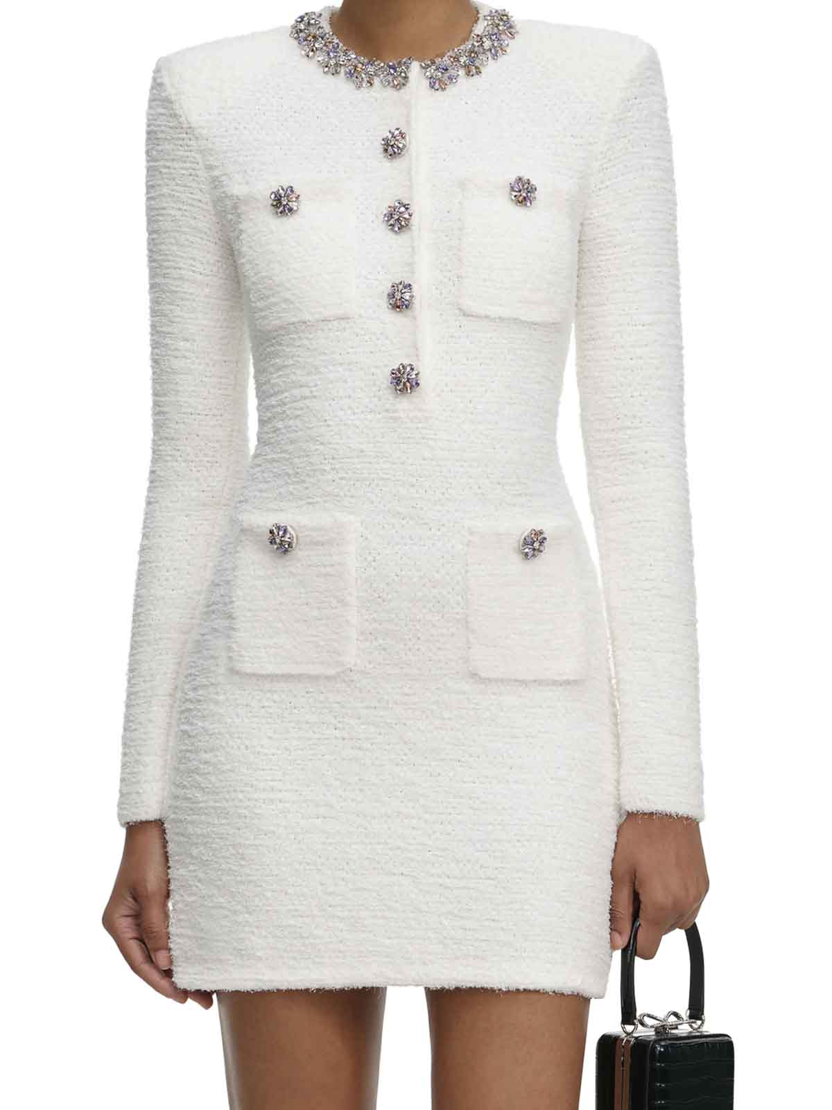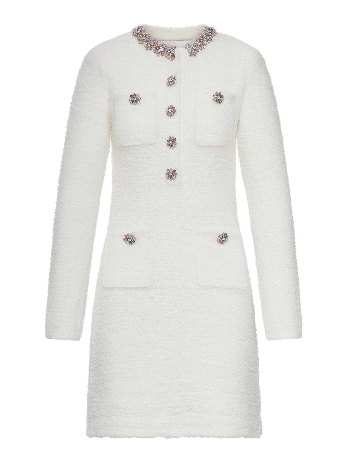Mini-robe en maille, tissu stretch, col rond avec détails ornés de bijoux, fermeture boutonnée sur le devant, ornements en strass, poches plaquées sur le devant, bretelles amovibles, le mannequin mesure 178 cm et porte une taille S, couleur : blanc