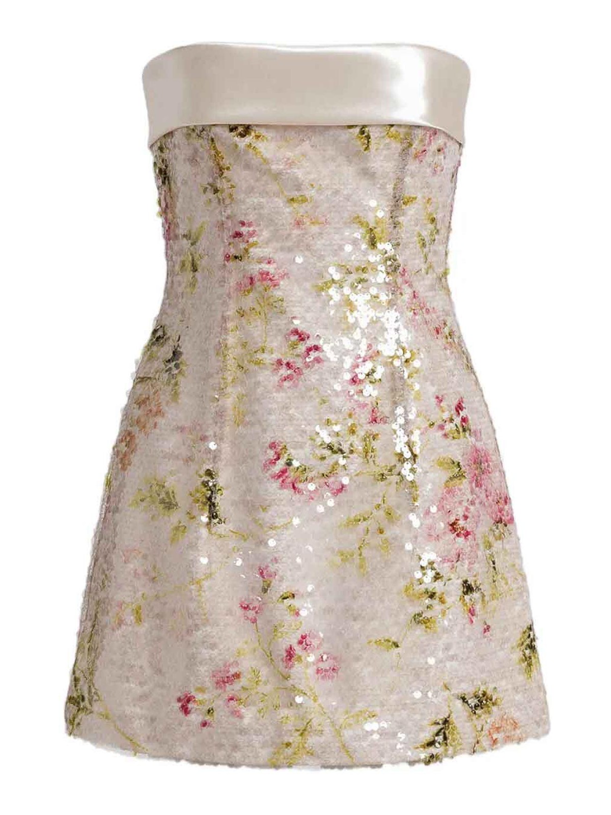Mini-robe Alberta Ferretti avec sequins à imprimé floral, sans manches, doublure en satin sur le corsage.