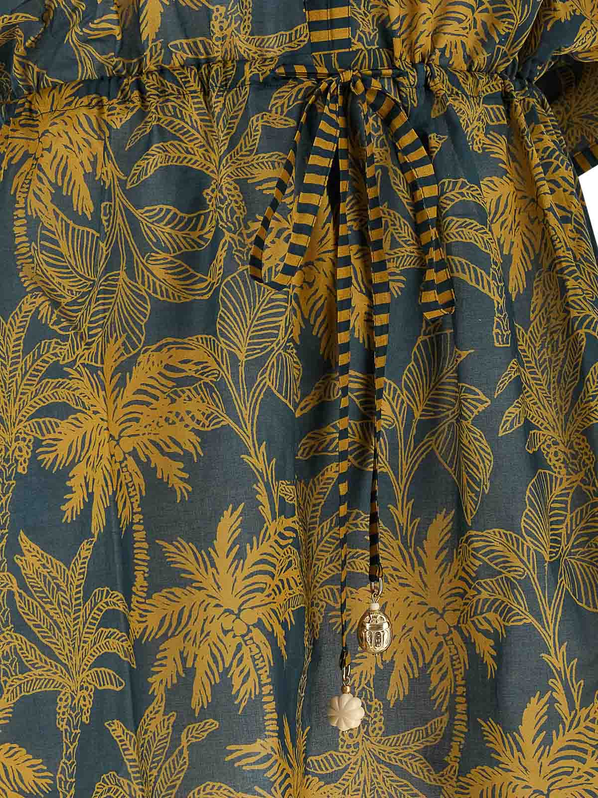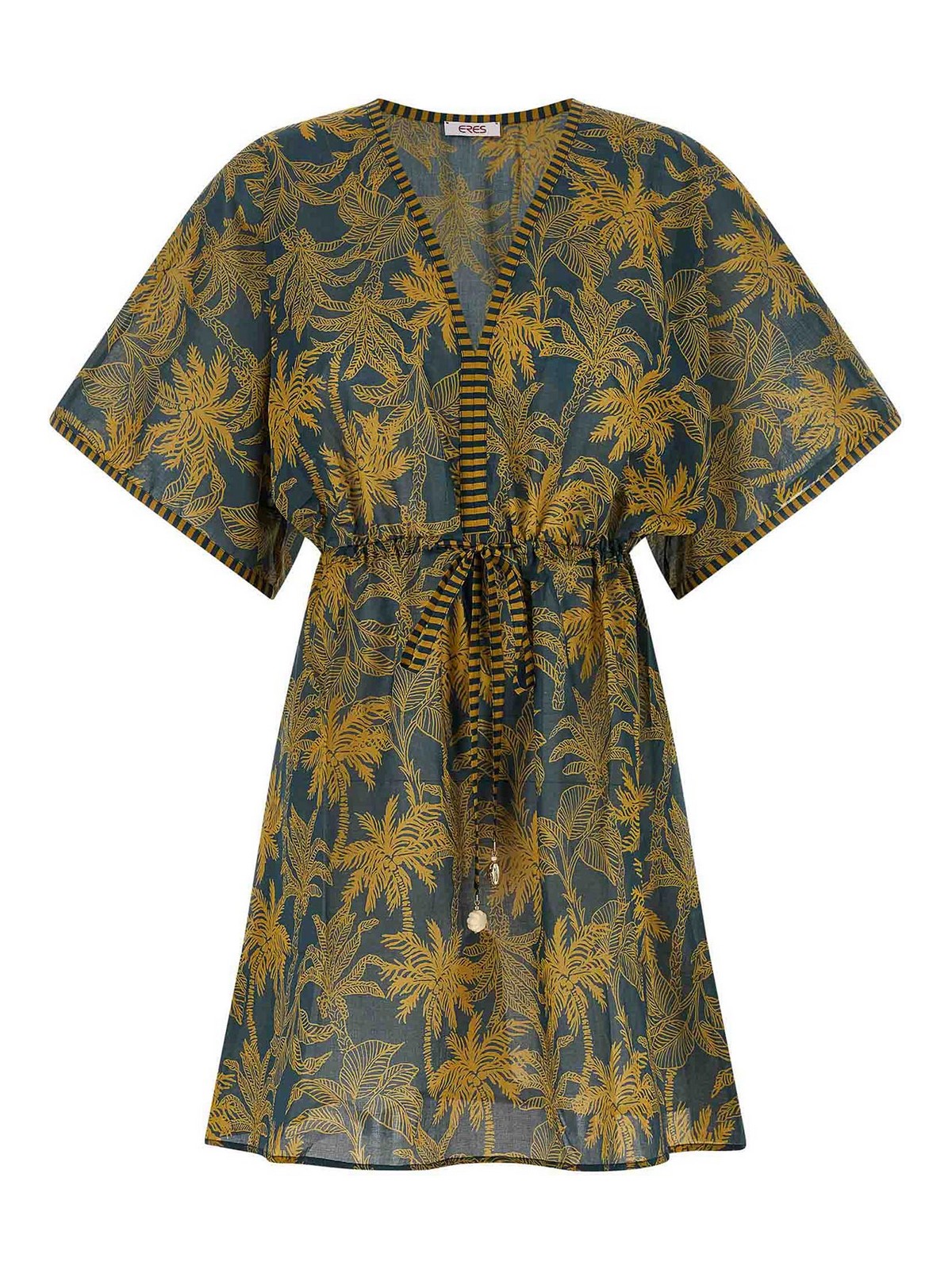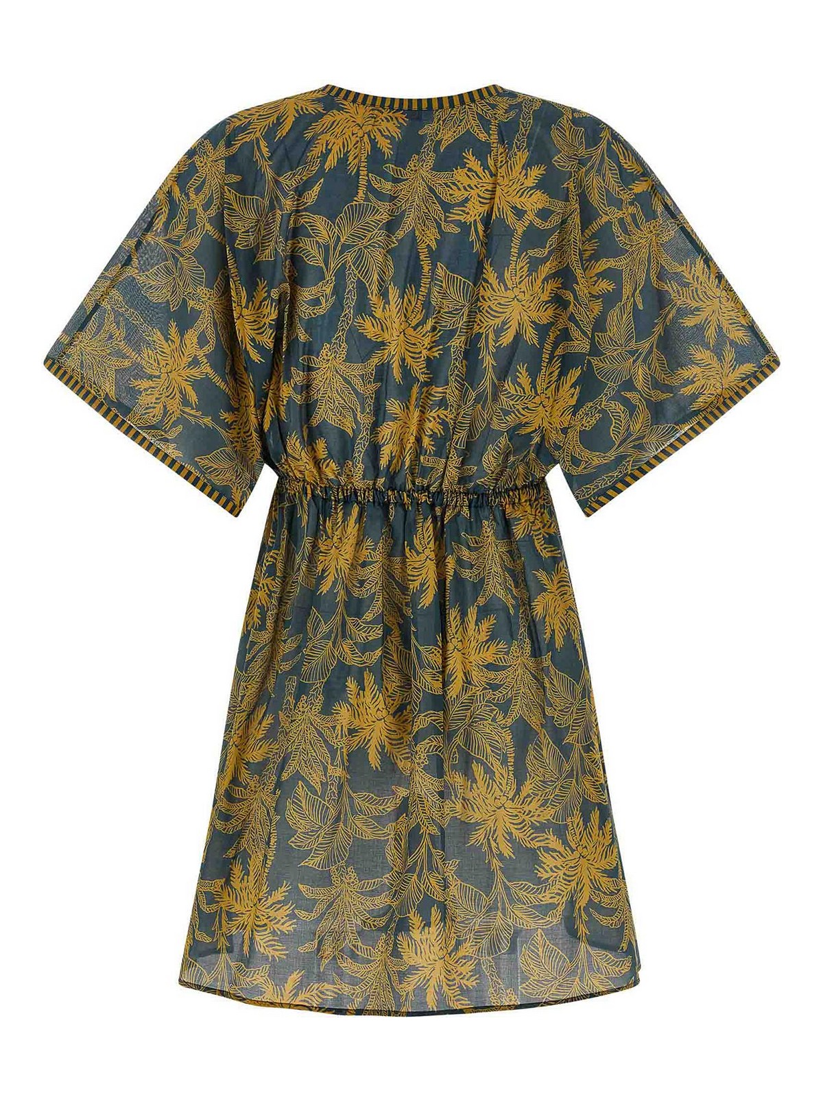 mini-robe Pinsula en voile de coton à motif imprimé Voyage Ocean, style caftan avec couvre-costume, col en V, larges manches courtes avec épaules tombantes, élastique dorsal avec cordon de serrage à la taille.