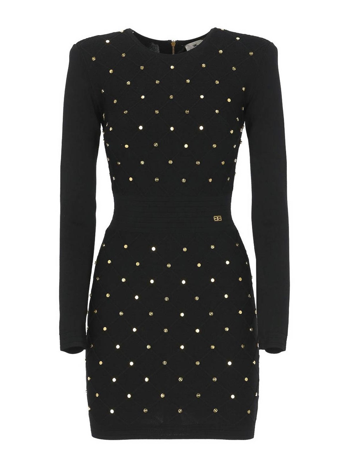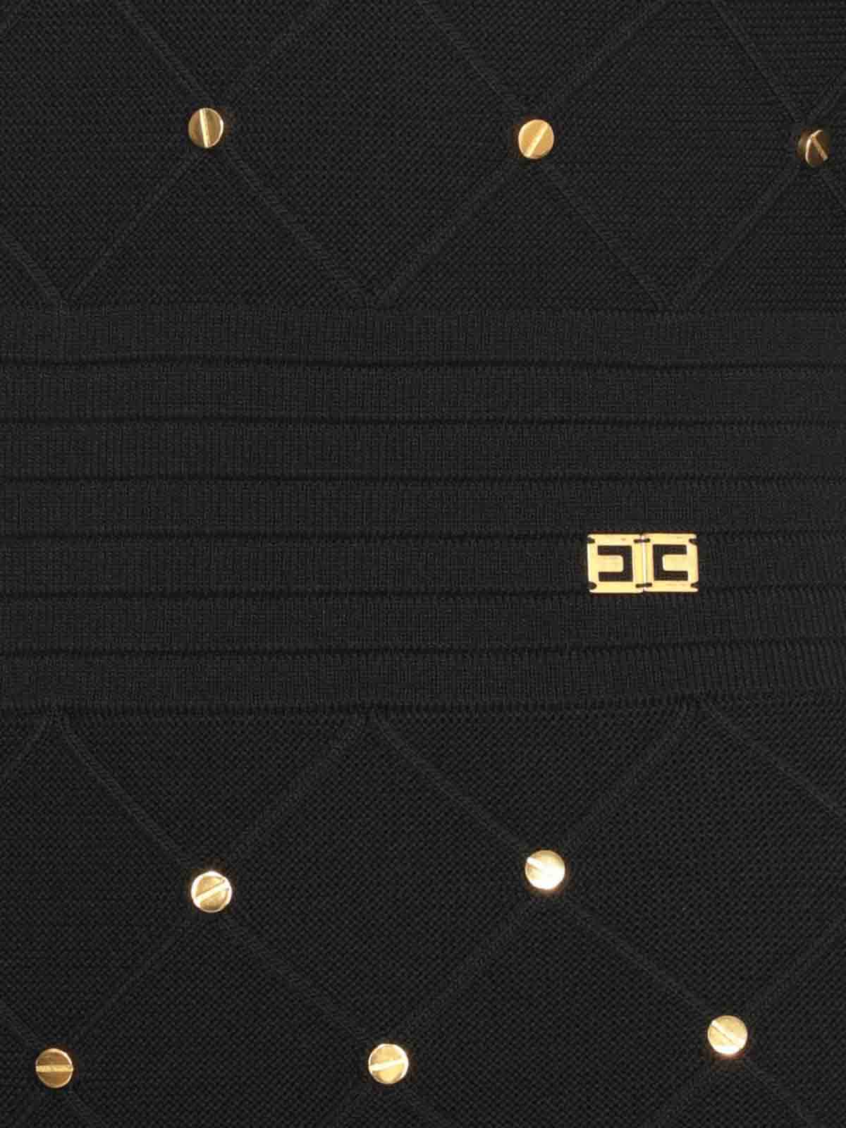 Mini-robe en maille Elisabetta Franchi avec détails ornés de bijoux, épaules structurées, col rond et manches longues, motif en losange avec côtes surélevées, ornée de boutons en métal doré qui ajoutent une touche scintillante. Fermeture éclair ornée de bijoux dans le dos. slim f