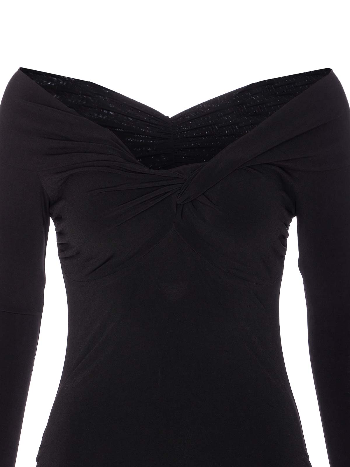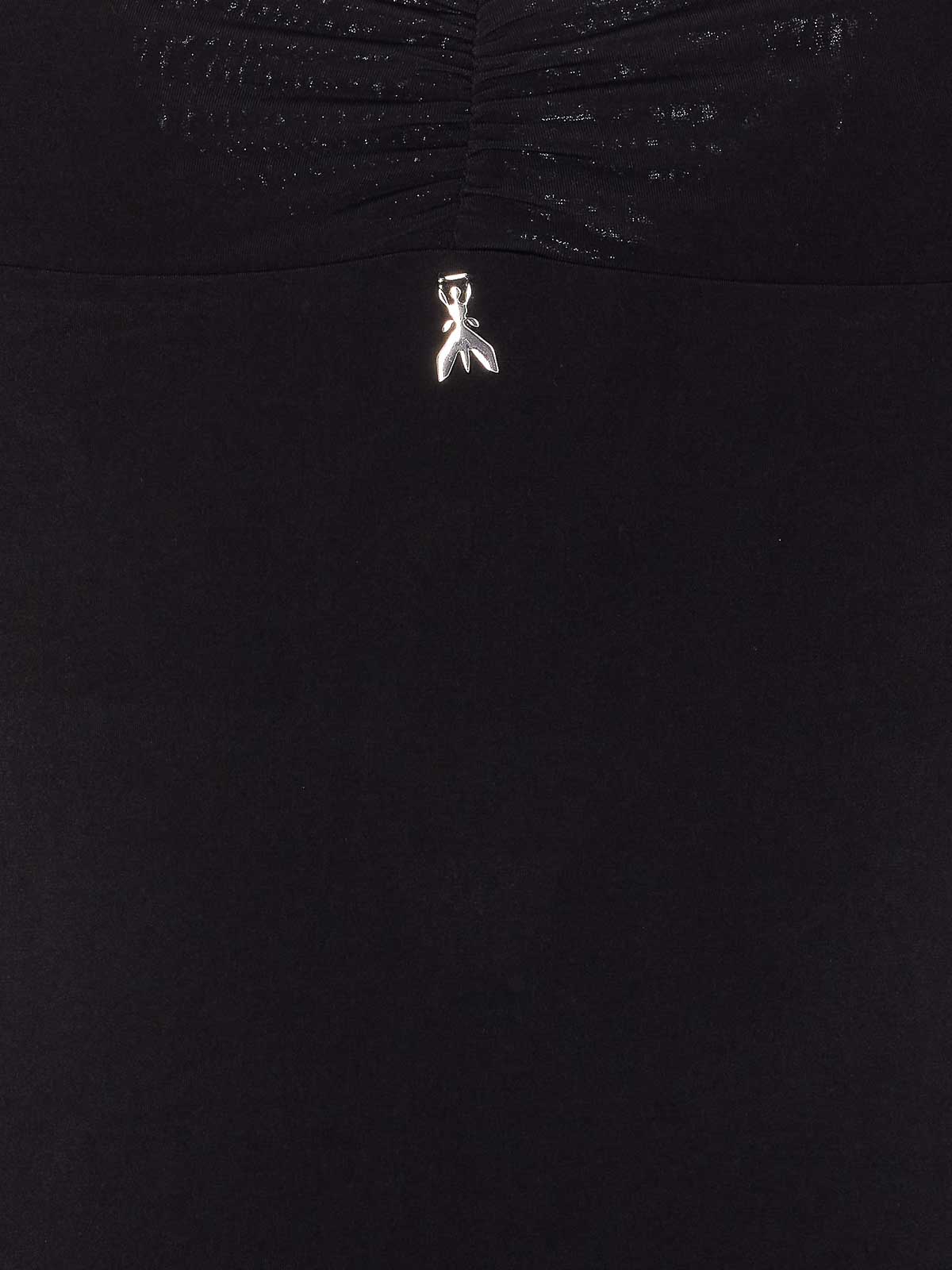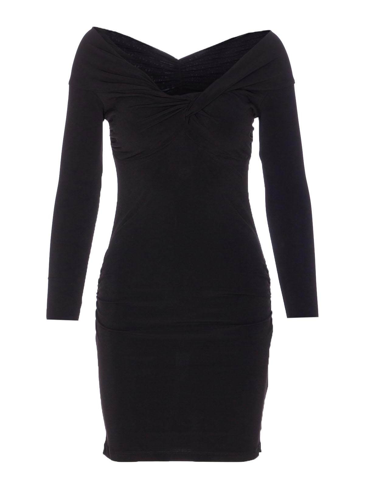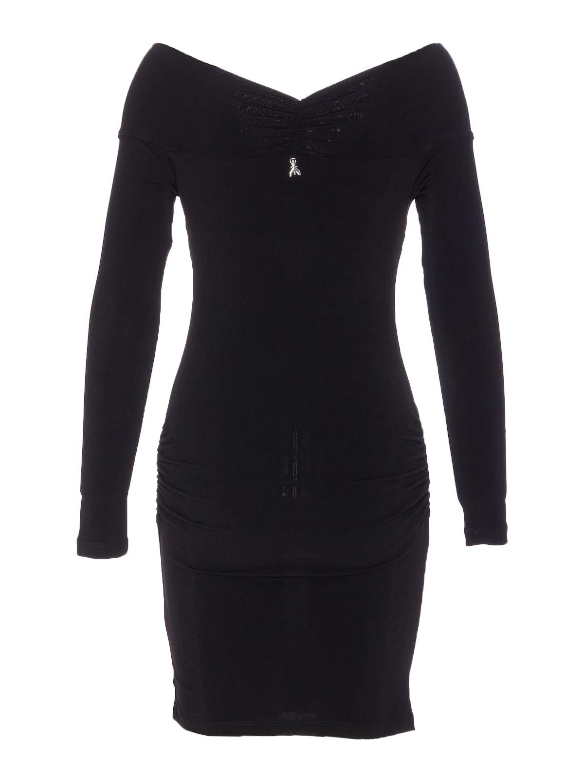 Robe noire Patrizia Pepe, coupe moulante, encolure large, logo à plaque, manches longues, mini-modèle