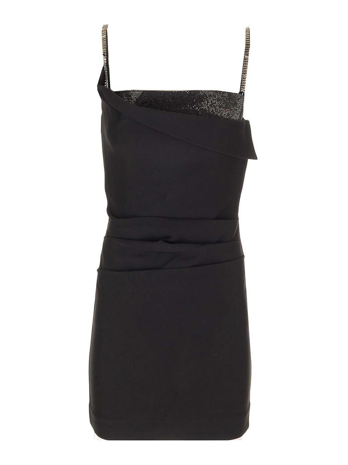 Mini-robe en crêpe stretch noir de Roland Mouret, avec insert en micro strass et perles cousues sur les bretelles, drapées sur l'encolure et sur le devant.
