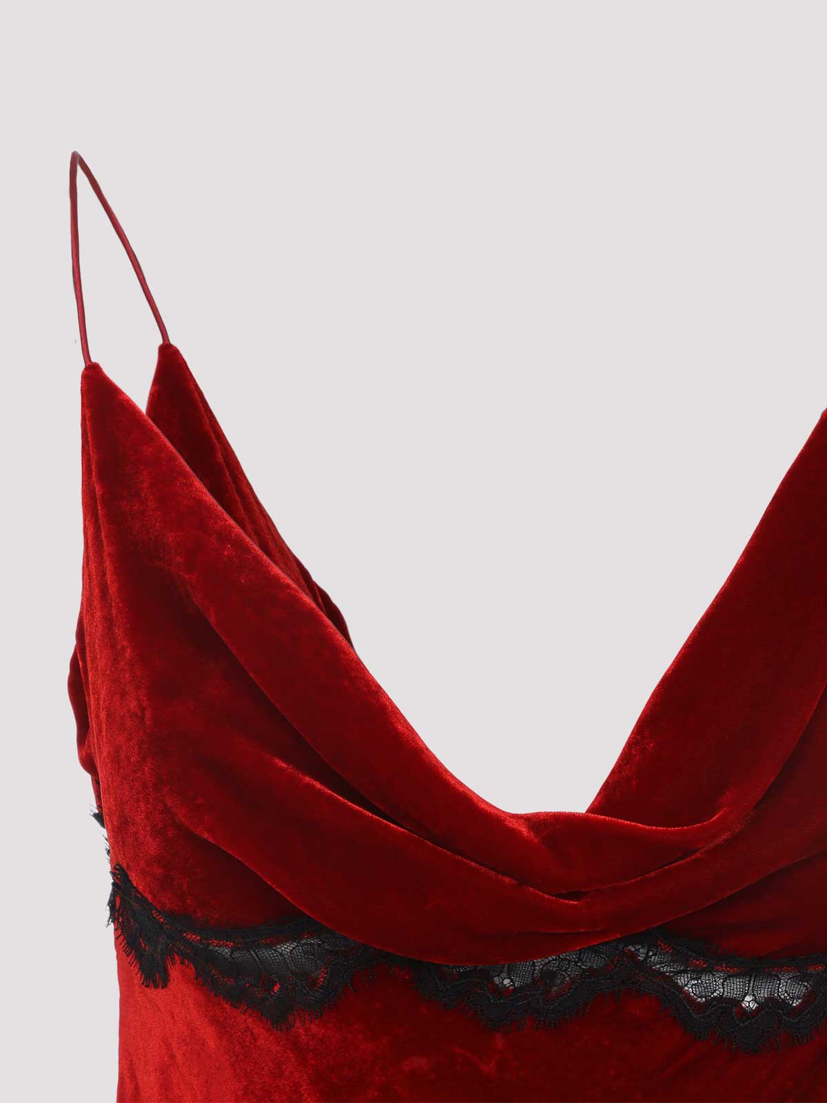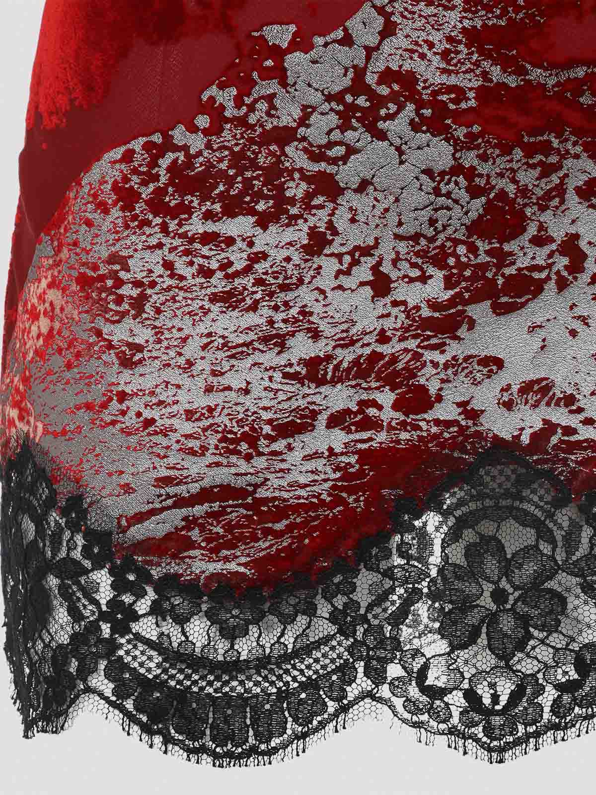 Mini-robe rouge foncé Roberto Cavalli confectionnée en chenille rouge foncé effet vieilli, encolure drapée, une fine bretelle, dentelle noire à la taille et à l'ourlet