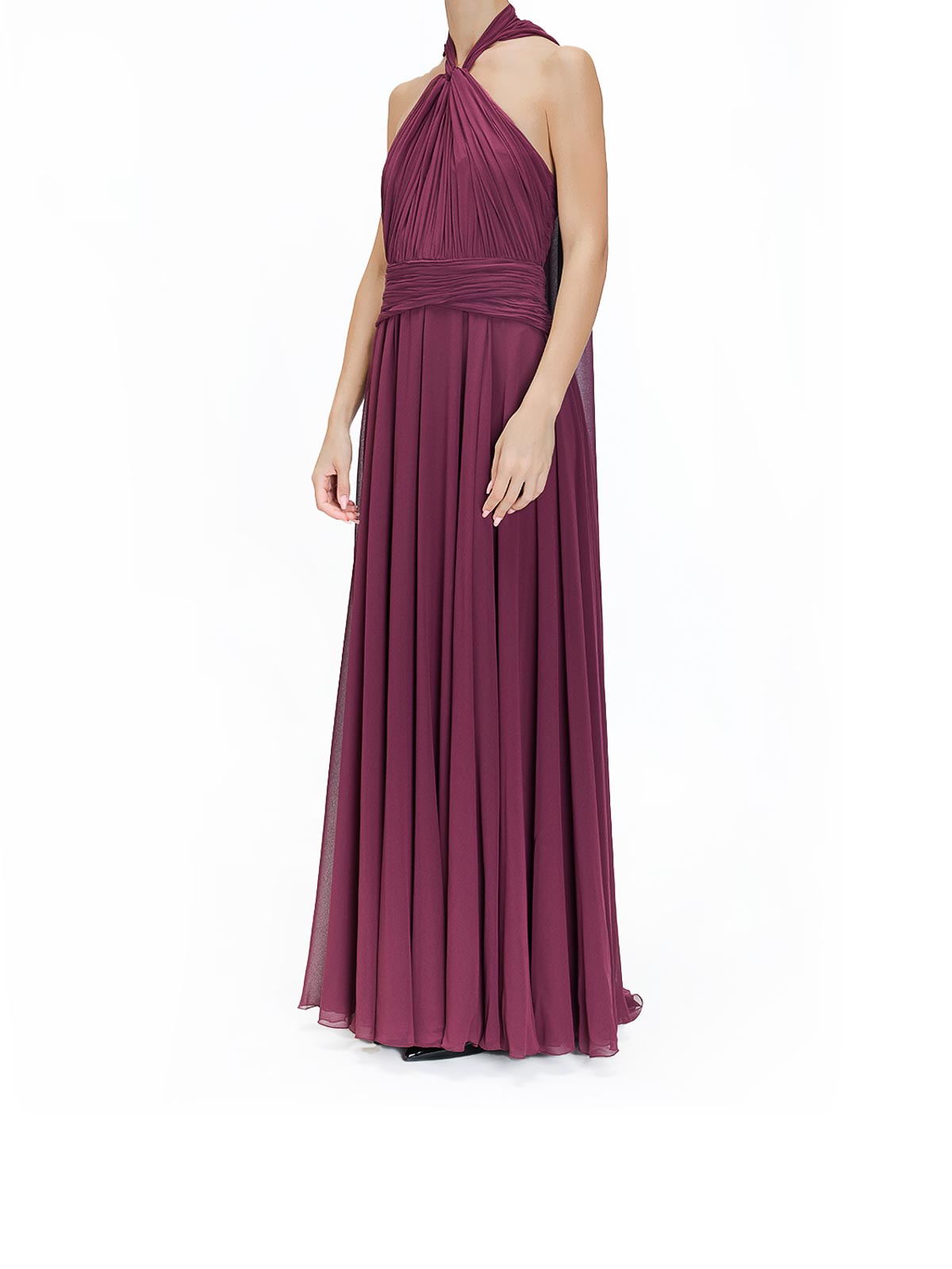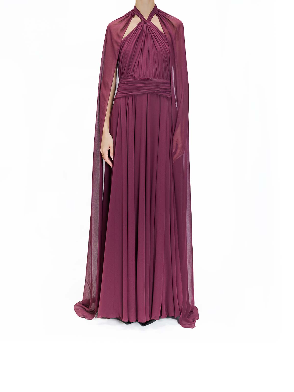 Robe longue cape bordeaux en mousseline, robe genny en mousseline ornée d'une cape, d'une traîne et d'une jupe plissée. Il est doté d'une encolure croisée et d'une bande qui marque la taille, d'une cape avec traîne, d'une jupe plissée, d'une encolure croisée, d'une ceinture, d'une fermeture zippée dans le dos, couleur : bordeaux, 100 % polyester, fabriqué en Italie,
