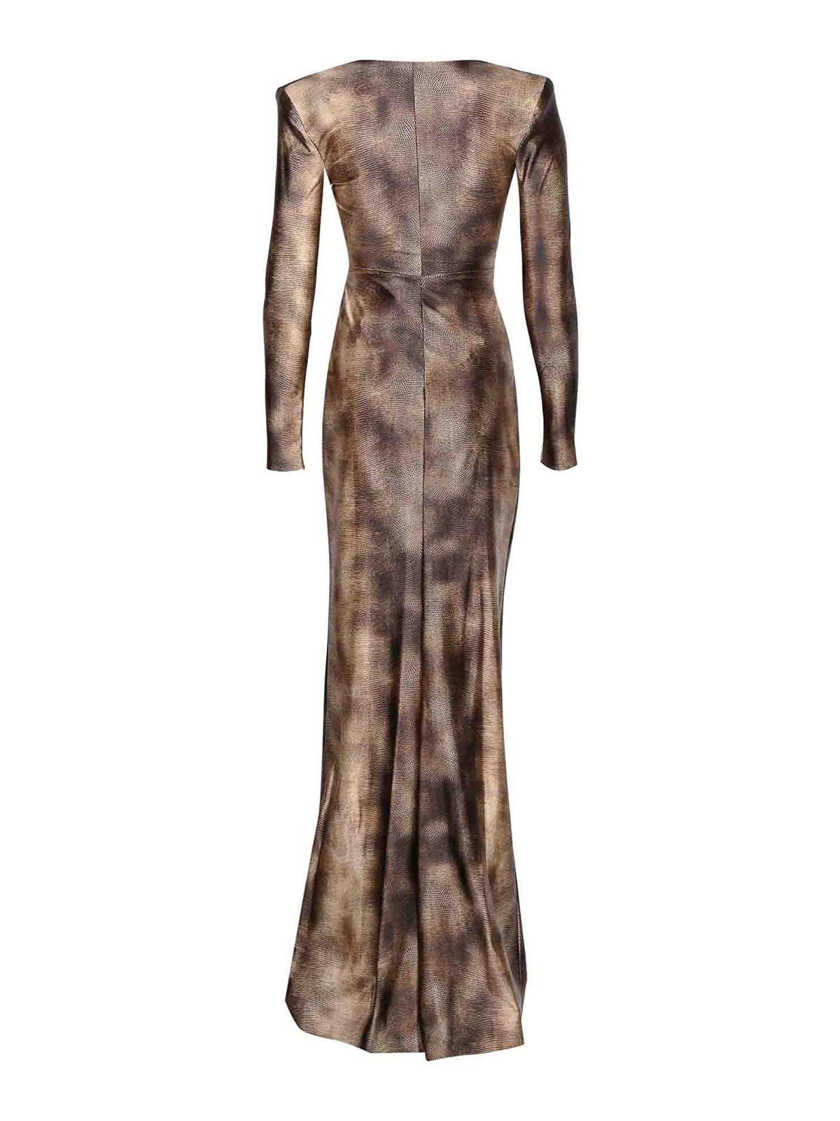 Lycra, imprimé intégral, manches longues, épaules rembourrées, V profond, col fendu, design drapé avec accessoire orné de bijoux, fermeture éclair au dos, coupe ajustée