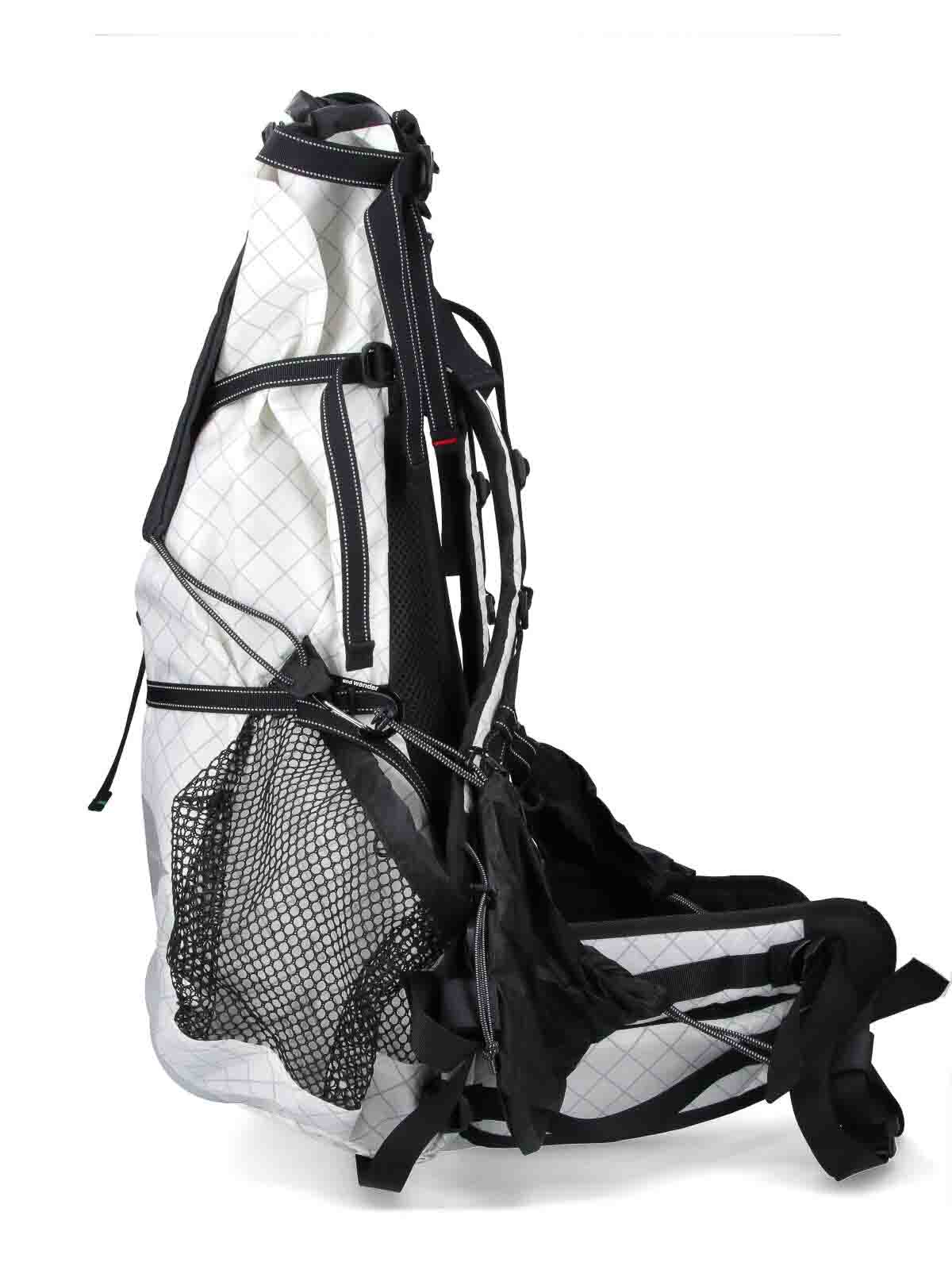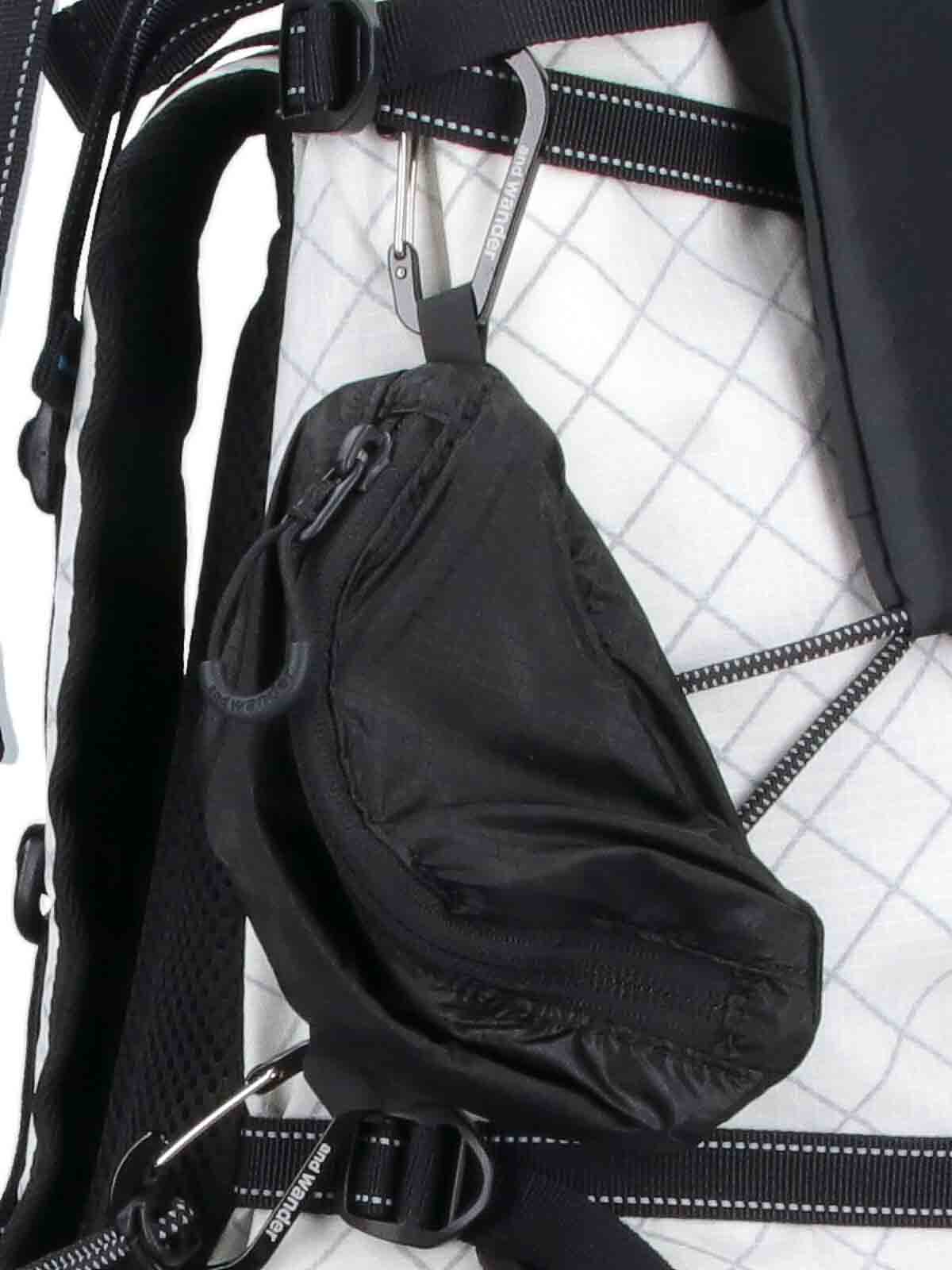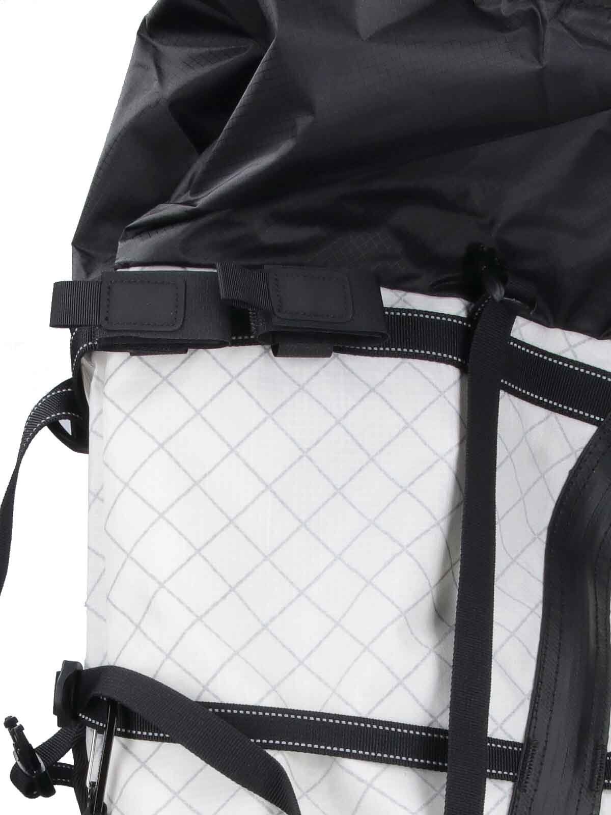 Sac à dos Ecopack 40l and Wander, en tissu blanc, finitions contrastantes noires, poignée supérieure, fermeture à cordon, bretelles et cordon de serrage réglables, détail de la pochette zippée avec mousqueton au dos, fermeture à boucle reliant les bretelles au dos, une poche avec boucles amovibles sur le devant, deux poches latérales en filet, une maxi poche zippée sur le devant, un logo contrasté sur le devant, deux poches intérieures plates, un compartiment intérieur principal.