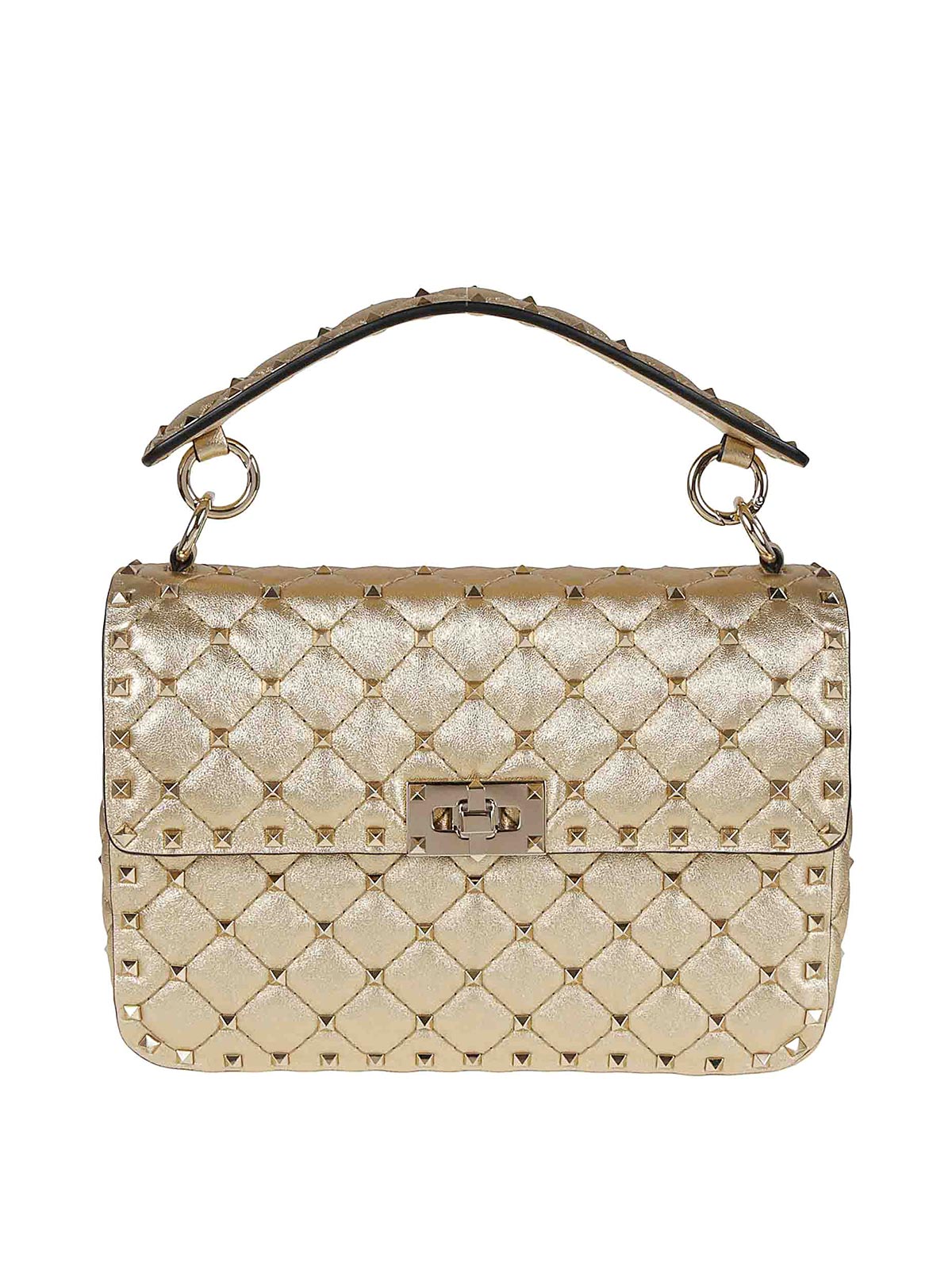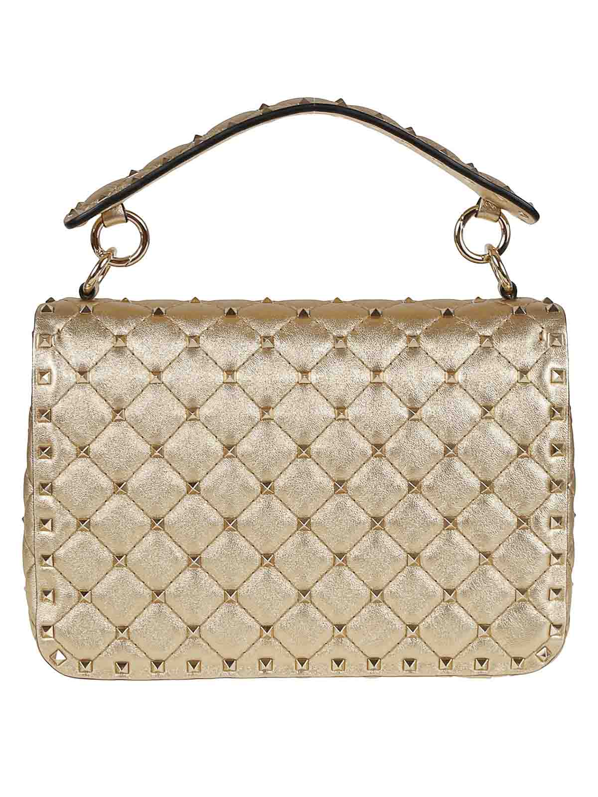 Sac RockStud Spike de Valentino Garavani, en nappa laminé, thème losange souligné par des coutures ton sur ton, orné et décoré de petits clous dorés.. Fermeture pivotante