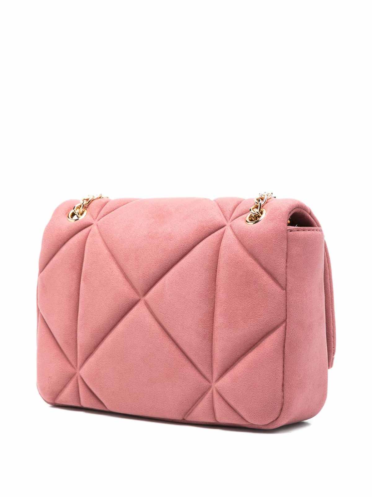 Motif matelassé rose, logo ton sur ton, bretelle en chaîne, rabat magnétique