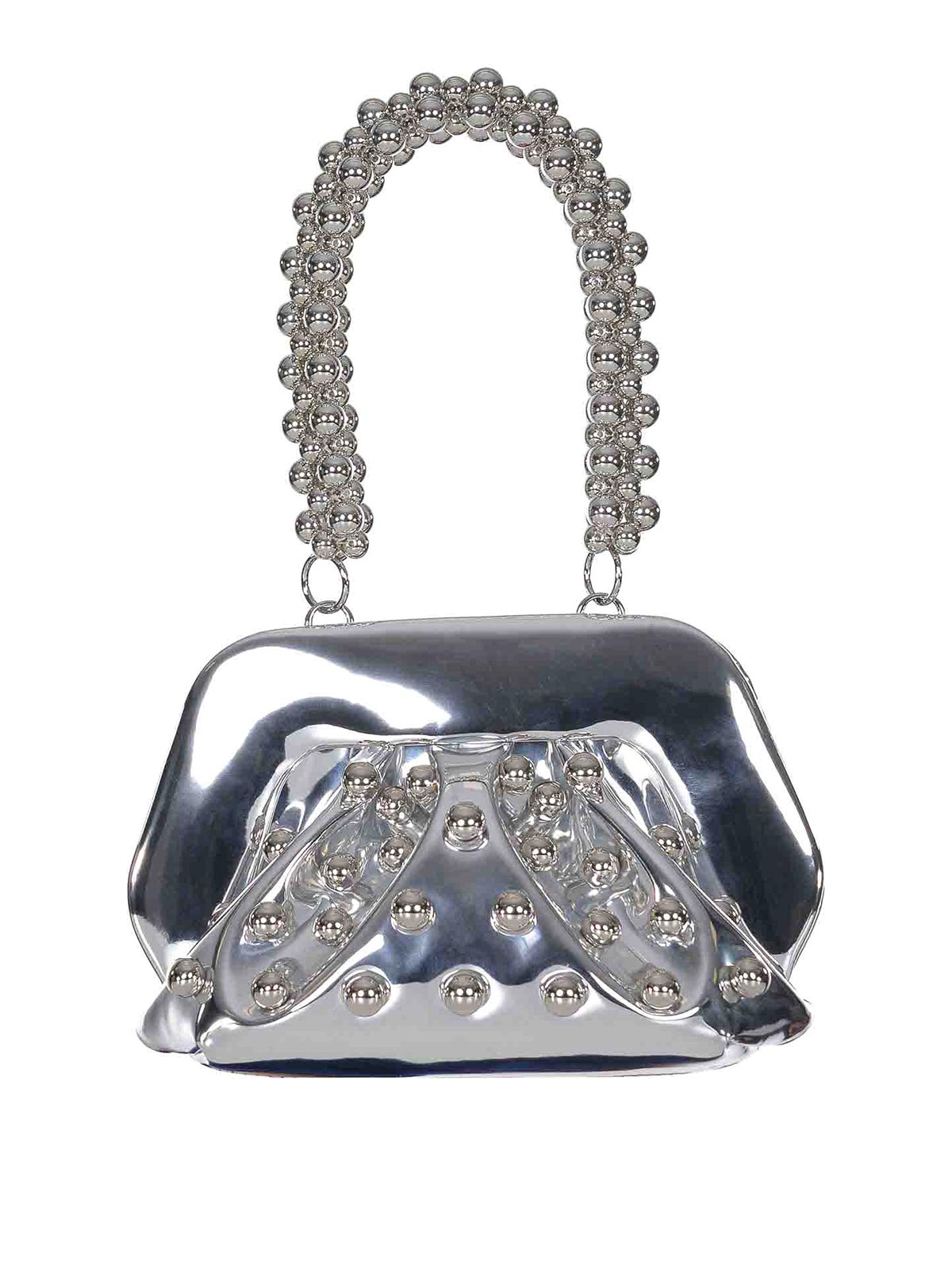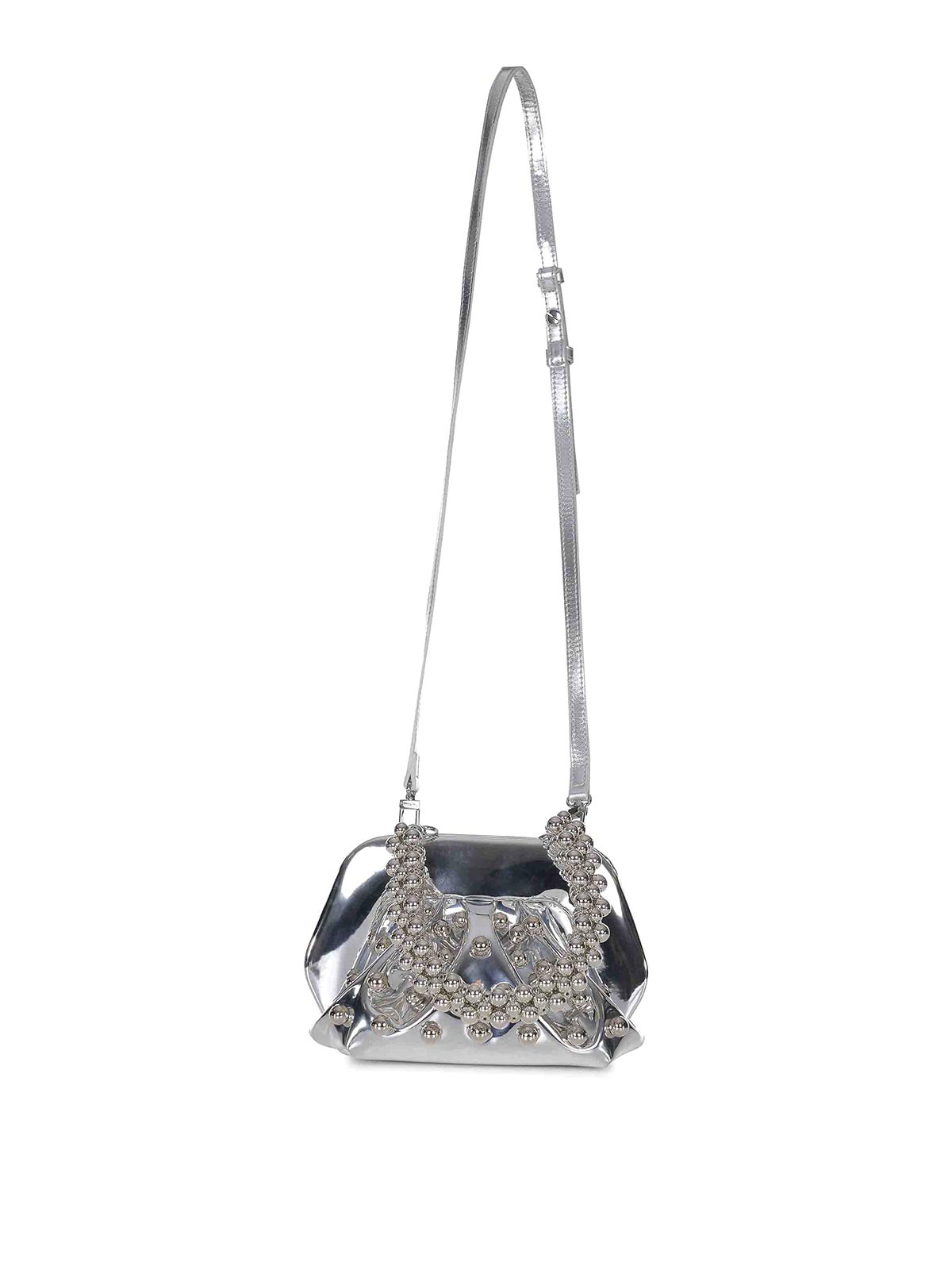 Sac à thé Themoir en argent écologique, effet miroir, produit avec des matériaux écologiques et durables, sphères froncées sur le dessus et au dos, bandoulière amovible et réglable, double doublure magnétique