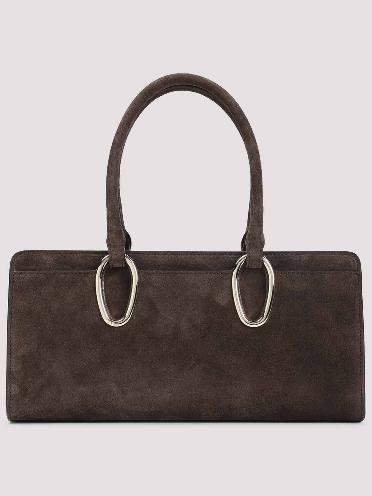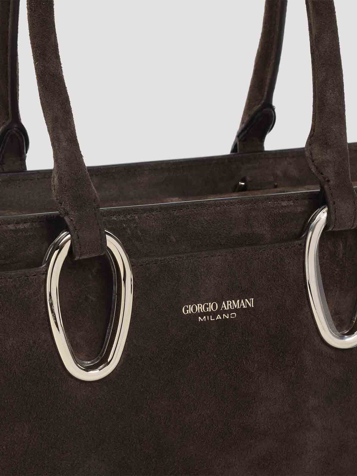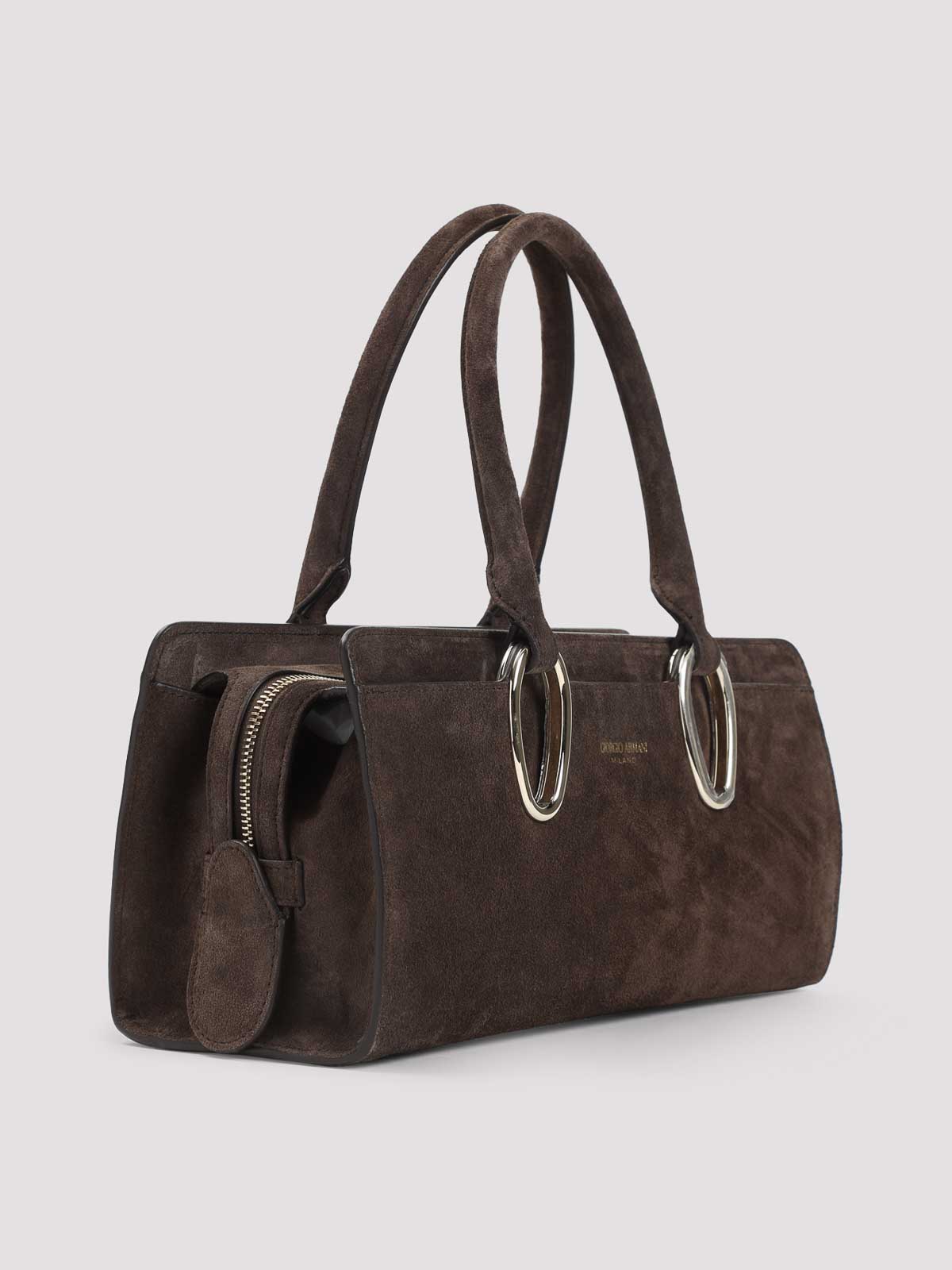 Sac à bandoulière en cuir de veau suédé marron Giorgio Armani. Fabriqué en cuir suédé marron foncé, poignées supérieures, détails d'anneaux en métal doré, logo estampé sur le devant, poches extérieures, fermeture zippée, poche intérieure zippée, doublure en daim, bandoulière amovible et réglable.
