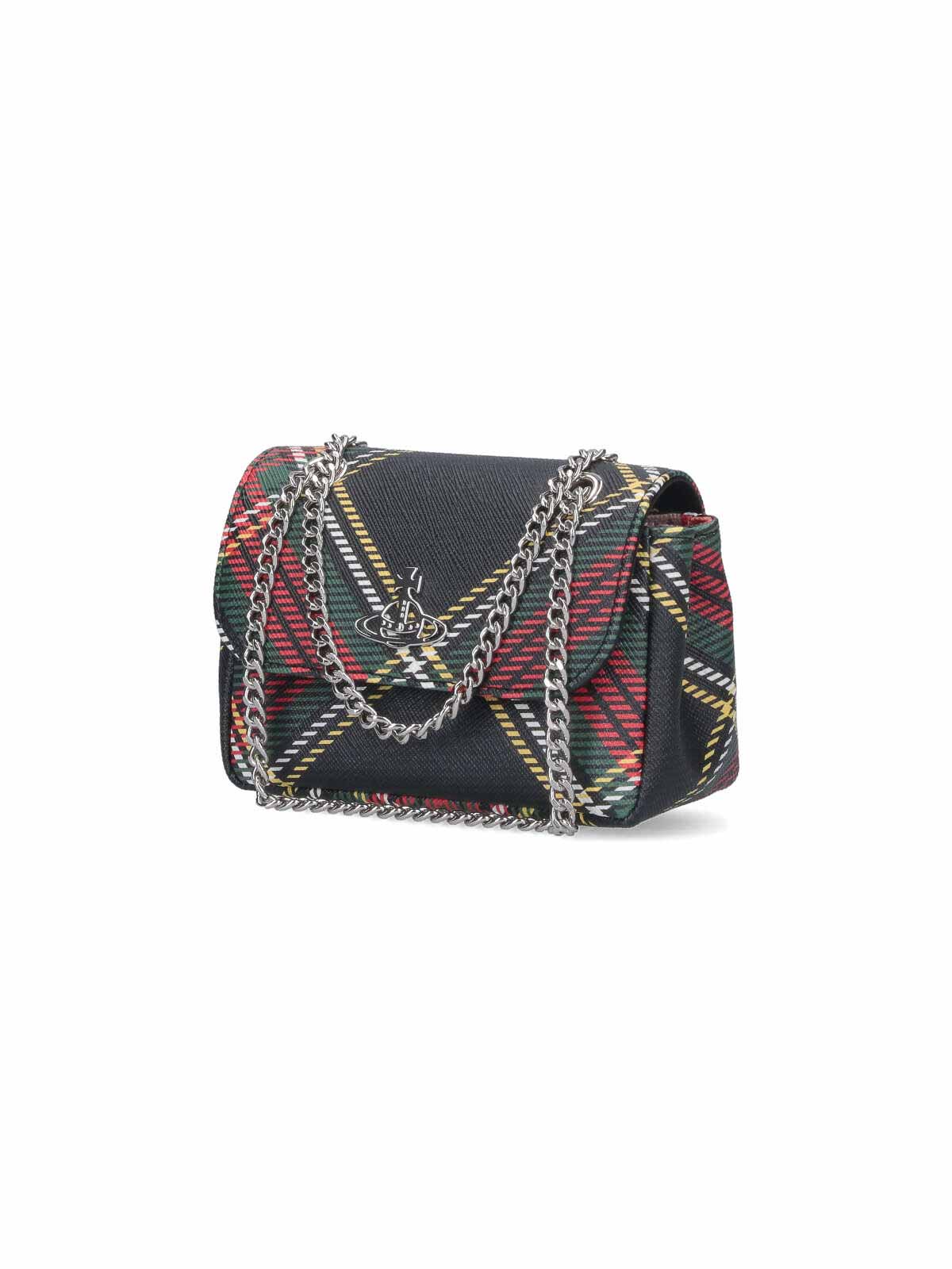 Petit sac Vivienne Westwood en tartan multicolore à motifs mixtes, deux poignées coulissantes en métal argenté, convertibles en patte magnétique, logo ORB en métal argenté, un seul compartiment