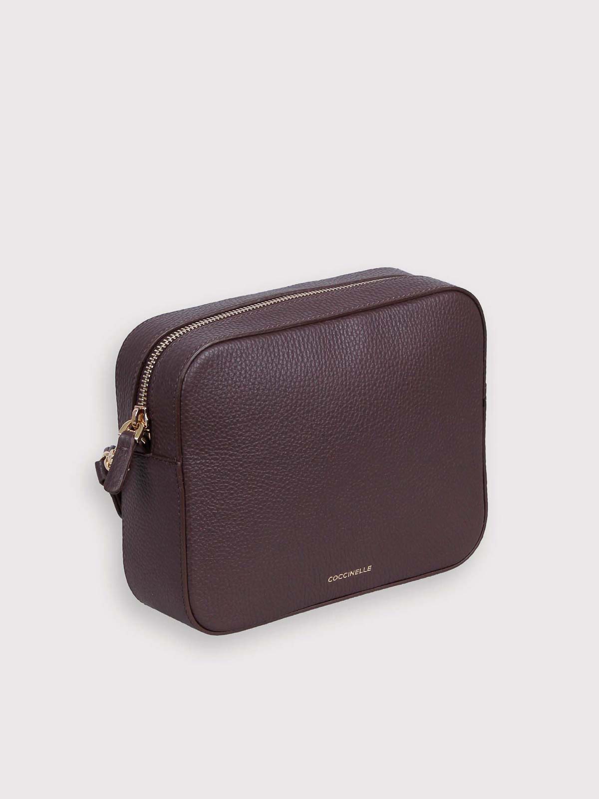 Sac à bandoulière Coccinelle Thebes. À porter en bandoulière, cuir pilé, fermeture zippée, bandoulière en tissu ajustable et amovible, poche intérieure, intérieur en tissu, placage doré, logo imprimé doré.