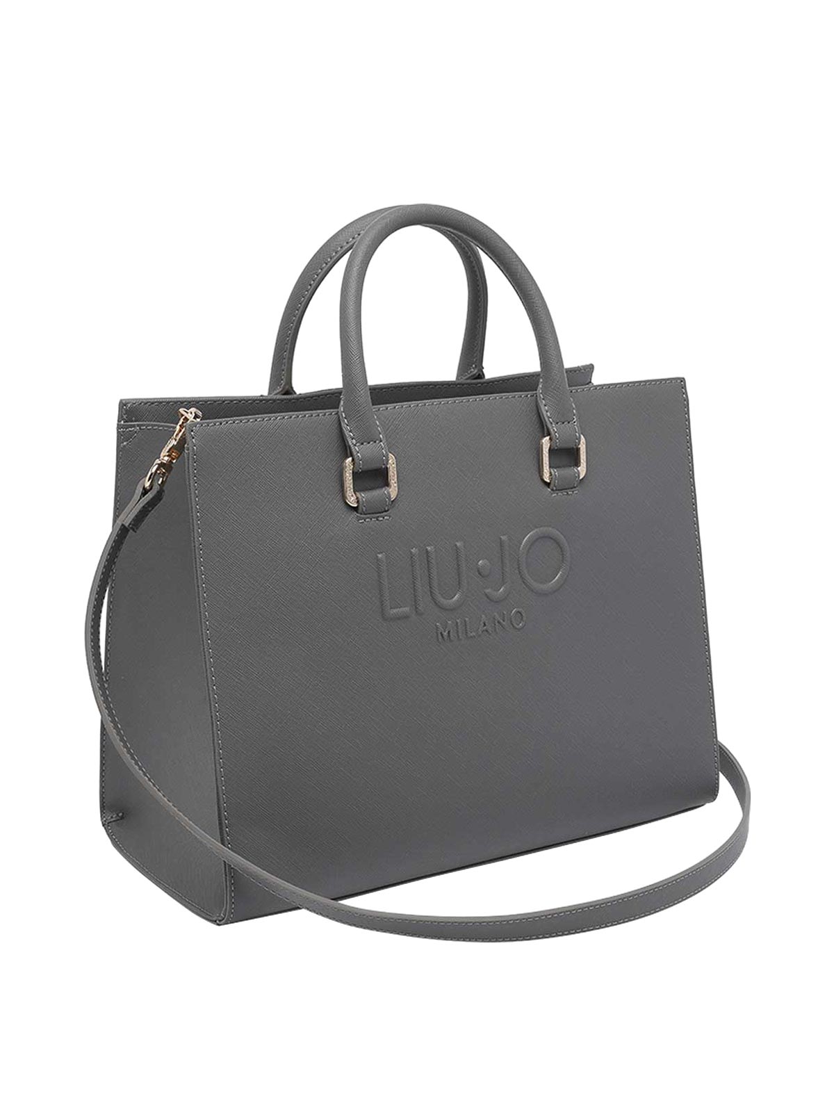 Sac à main à logo gris Liu jo, fermeture zippée, poche intérieure zippée, poche ouverte, 2 poignées, bandoulière adaptable et amovible, logo ton sur ton