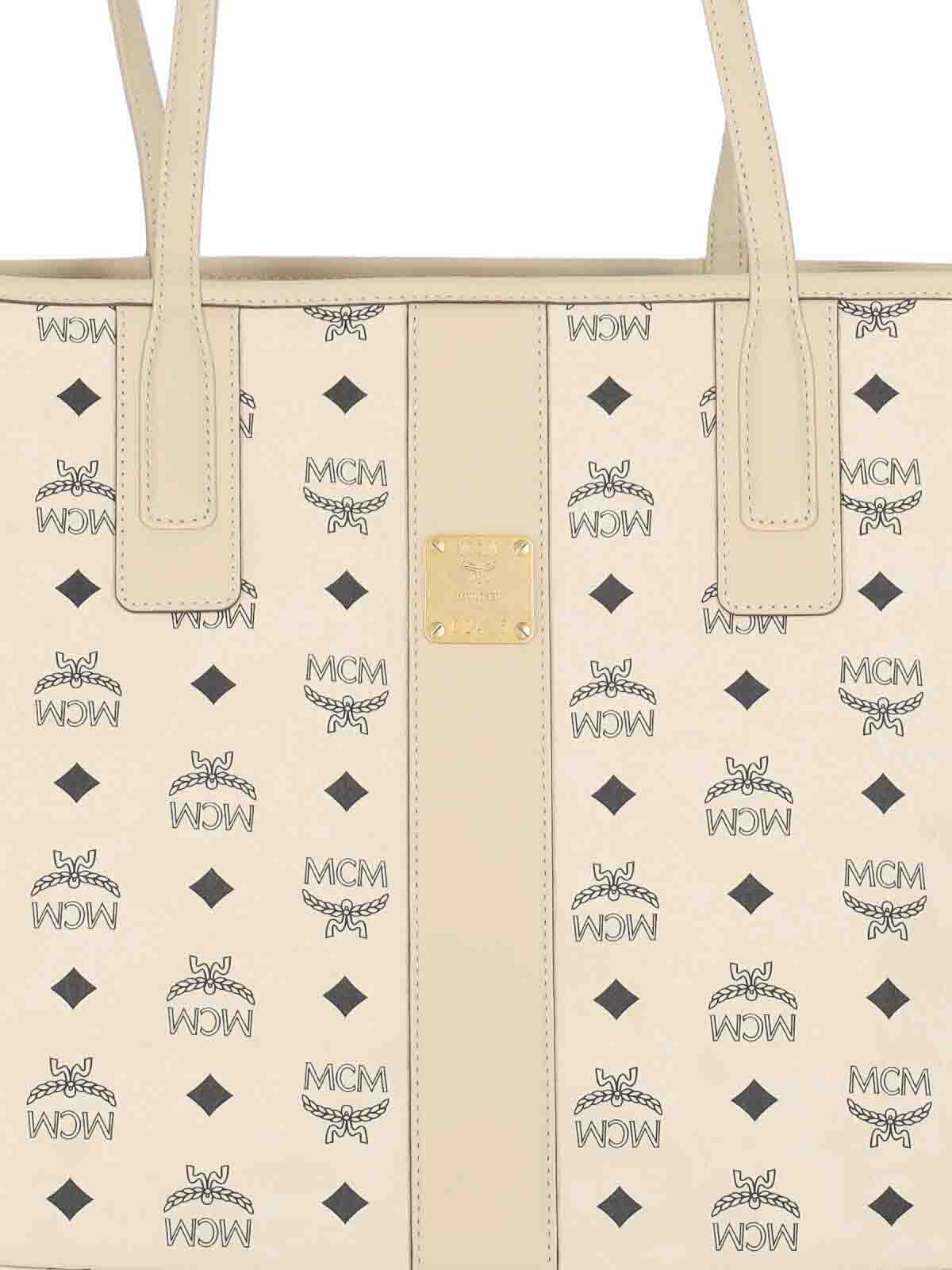 Sac fourre-tout réversible Medium Liz en éco-cuir visetos beige ton sur ton avec motif monogramme noir imprimé sur l'ensemble, deux poignées supérieures rigides, plaque en laiton doré avec logo Lauriel gravé sur le devant, cordon de serrage latéral, un compartiment principal, une pochette, fermeture éclair intérieure réglable amovible