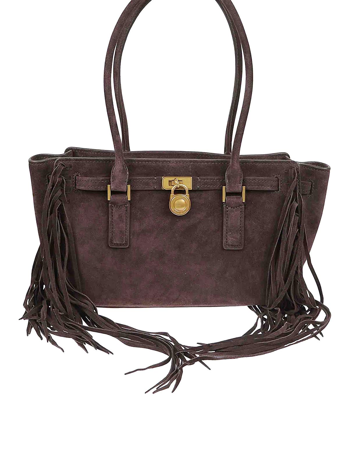 Sac en daim couleur chocolat, motif de franges, fermeture zippée, doubles poignées avec sangle et cadenas, parties métalliques dorées mates, deux poches intérieures,