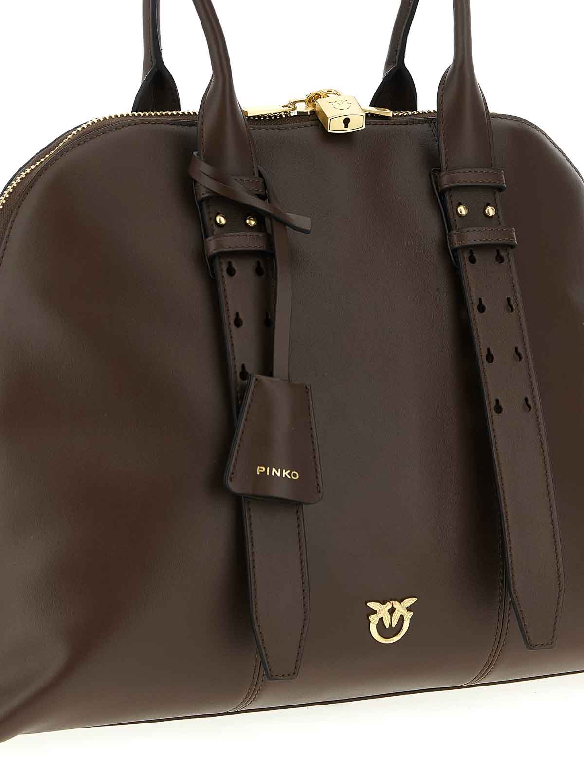 sac à main de bowling maxi en cuir Escape avec logo « Love Birds » en métal sur le devant et brodé au dos, double poignée réglable, fermeture zippée sur le dessus avec cadenas, base rigide avec pieds en métal, doublure en coton. bandoulière réglable et amovible.