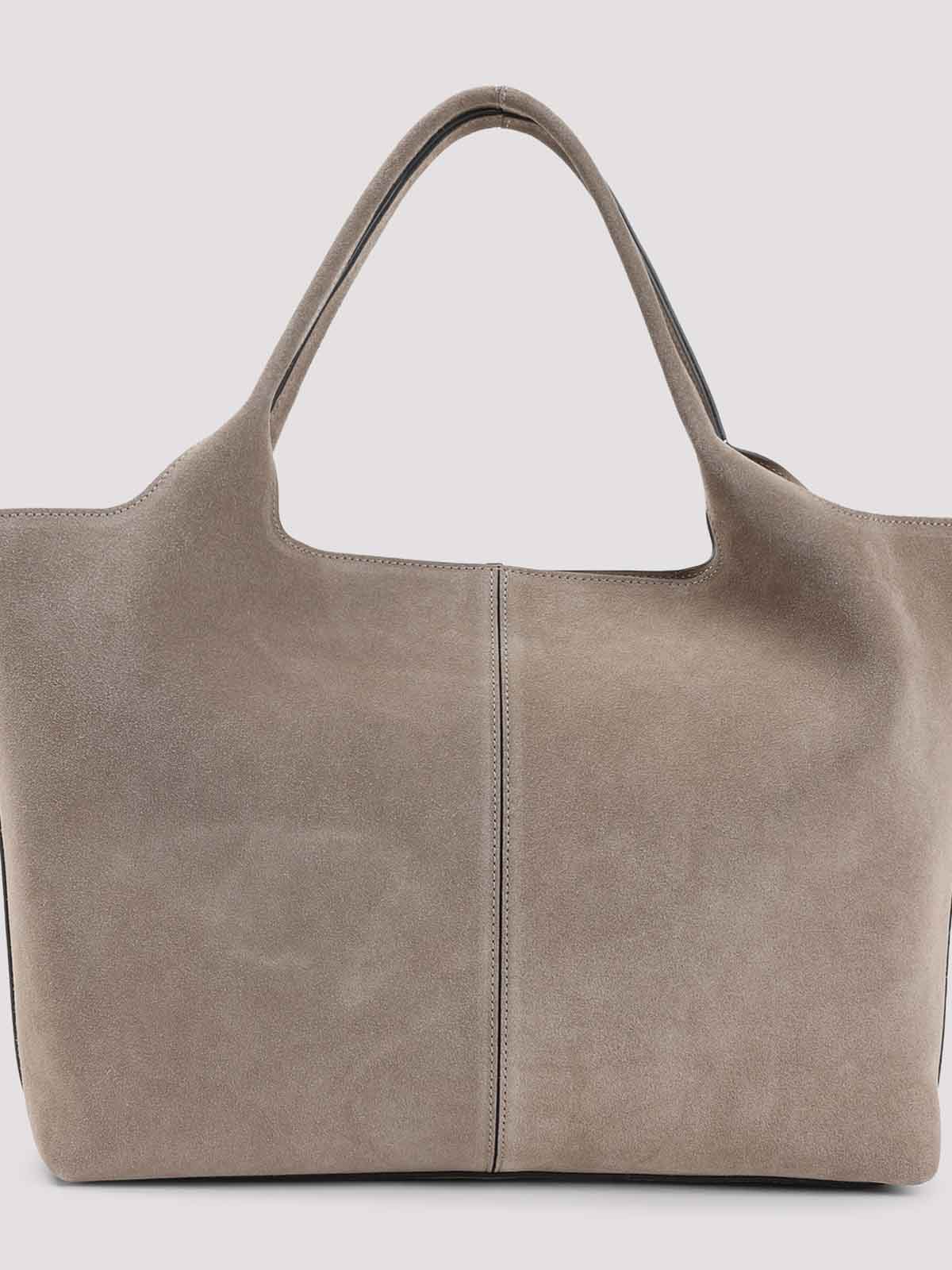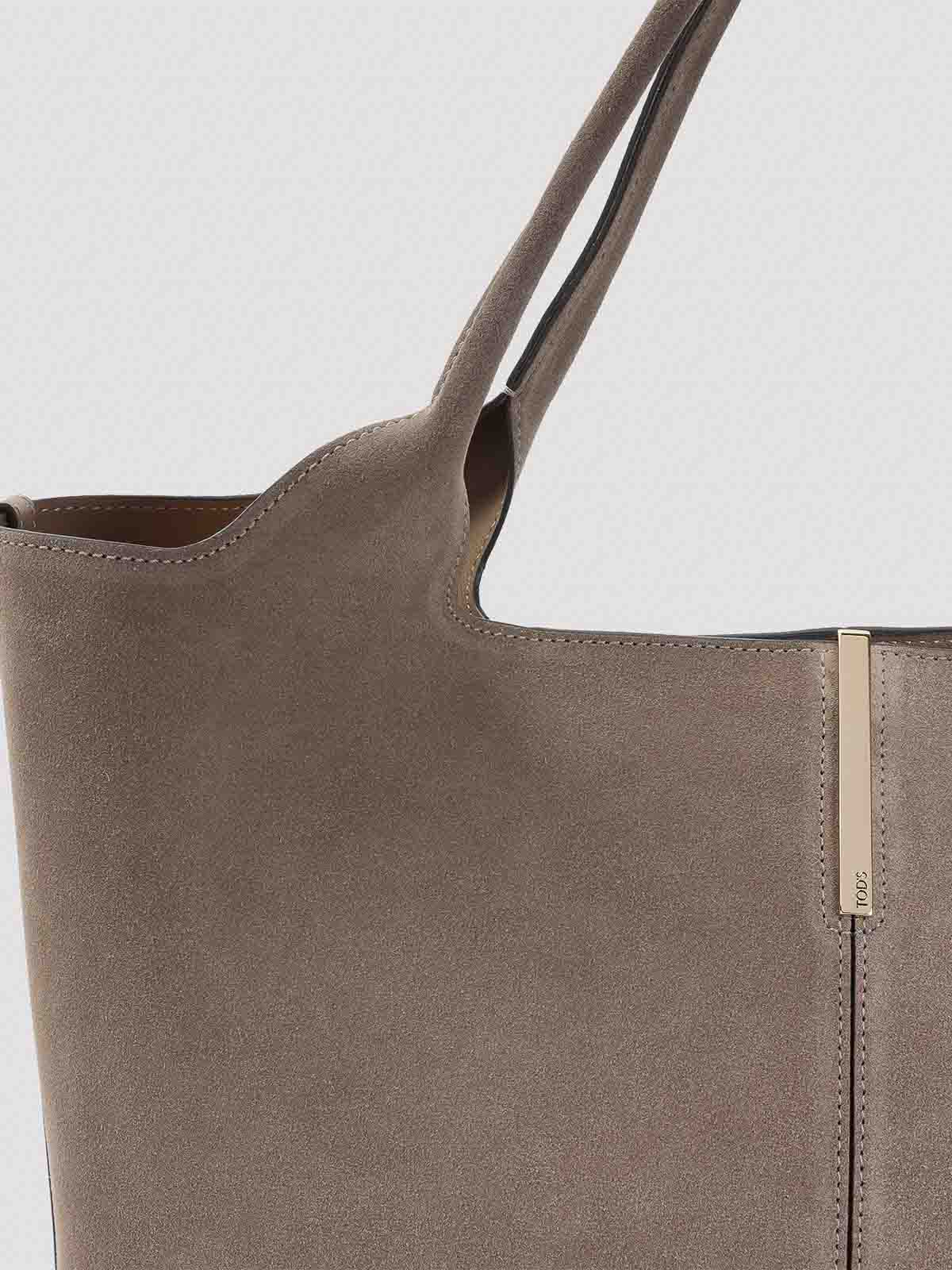 Sac de courses Tod's en cuir suédé beige clair. Sac de courses beige argile clair pur, poignées supérieures, fermeture par le haut, logo métallique doré sur le devant, un compartiment principal.