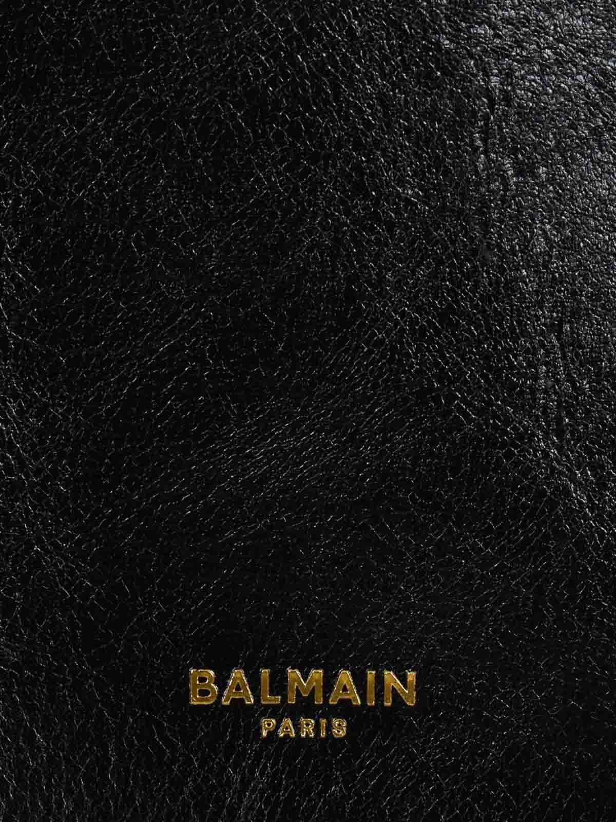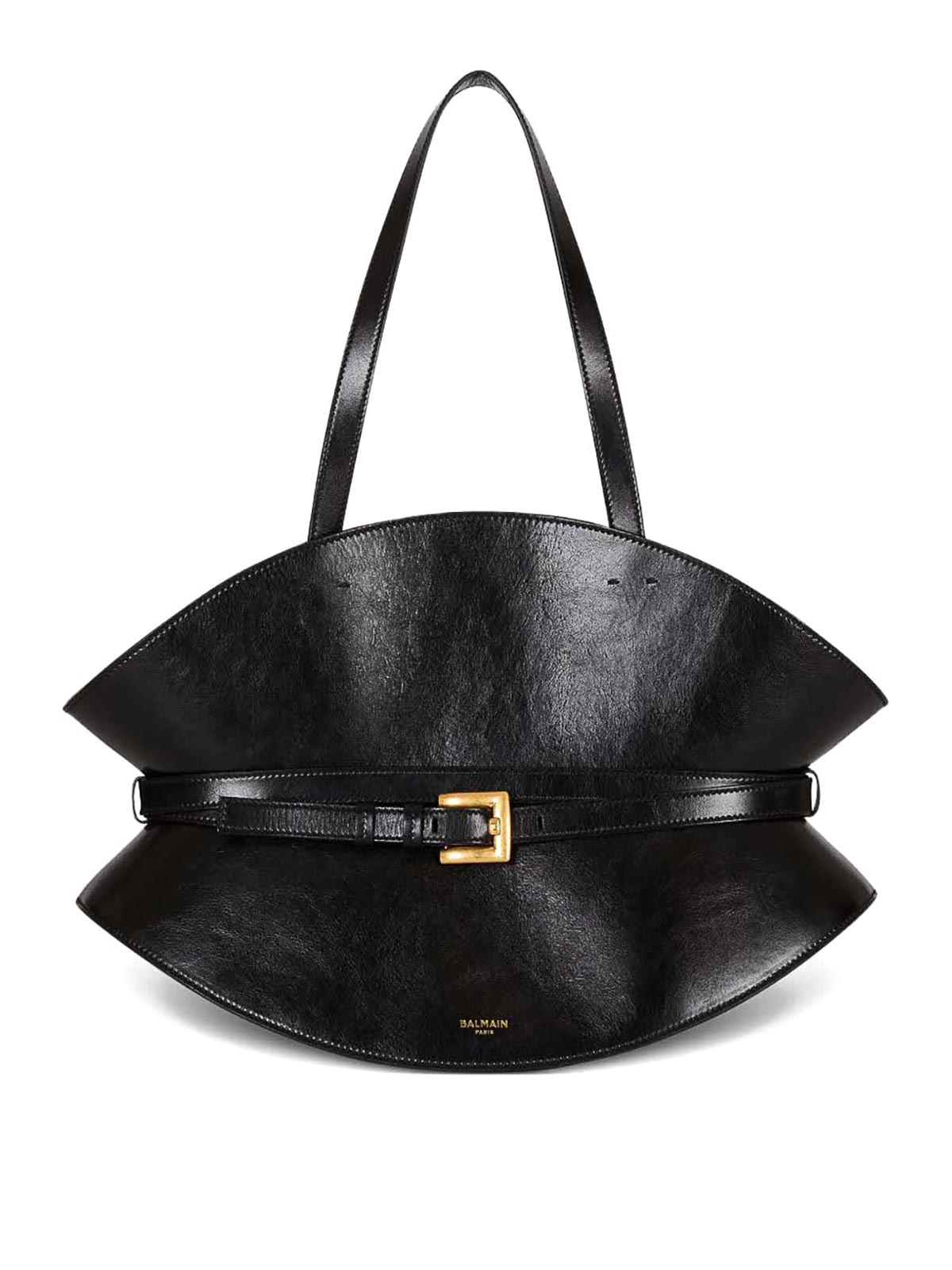 Sac Shuffle Medium en cuir de veau style ceinturé à porter à la main ou à l'épaule Poignées en cuir Ceinture à double tour Boucle métallique gravée PB Logo Balmain Paris doré embossé sur le devant Fermeture à nouer en cuir Poche intérieure en cuir et poche pour cartes Doublure en faux daim Quincaillerie dorée Dimensions : 16 x 45,5 x 31 cm Matière principale : 100 % cuir de veau fabriqué en Italie