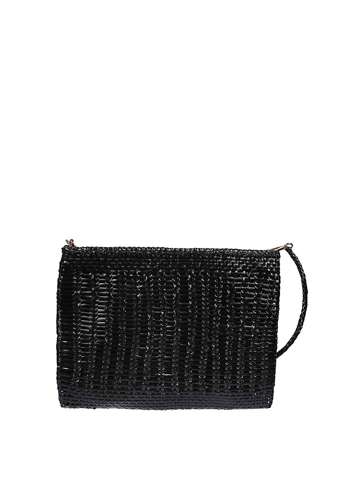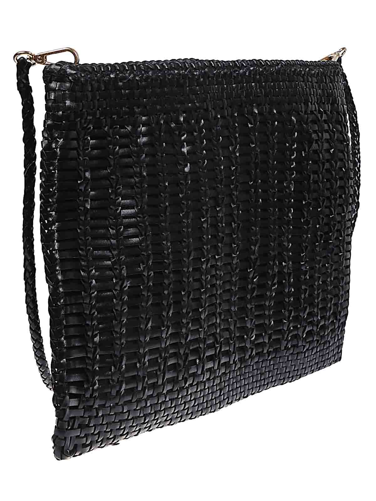 Couleur noire, motif tissé, compartiment unique, poche intérieure, fermeture zippée, bandoulière en cuir amovible.